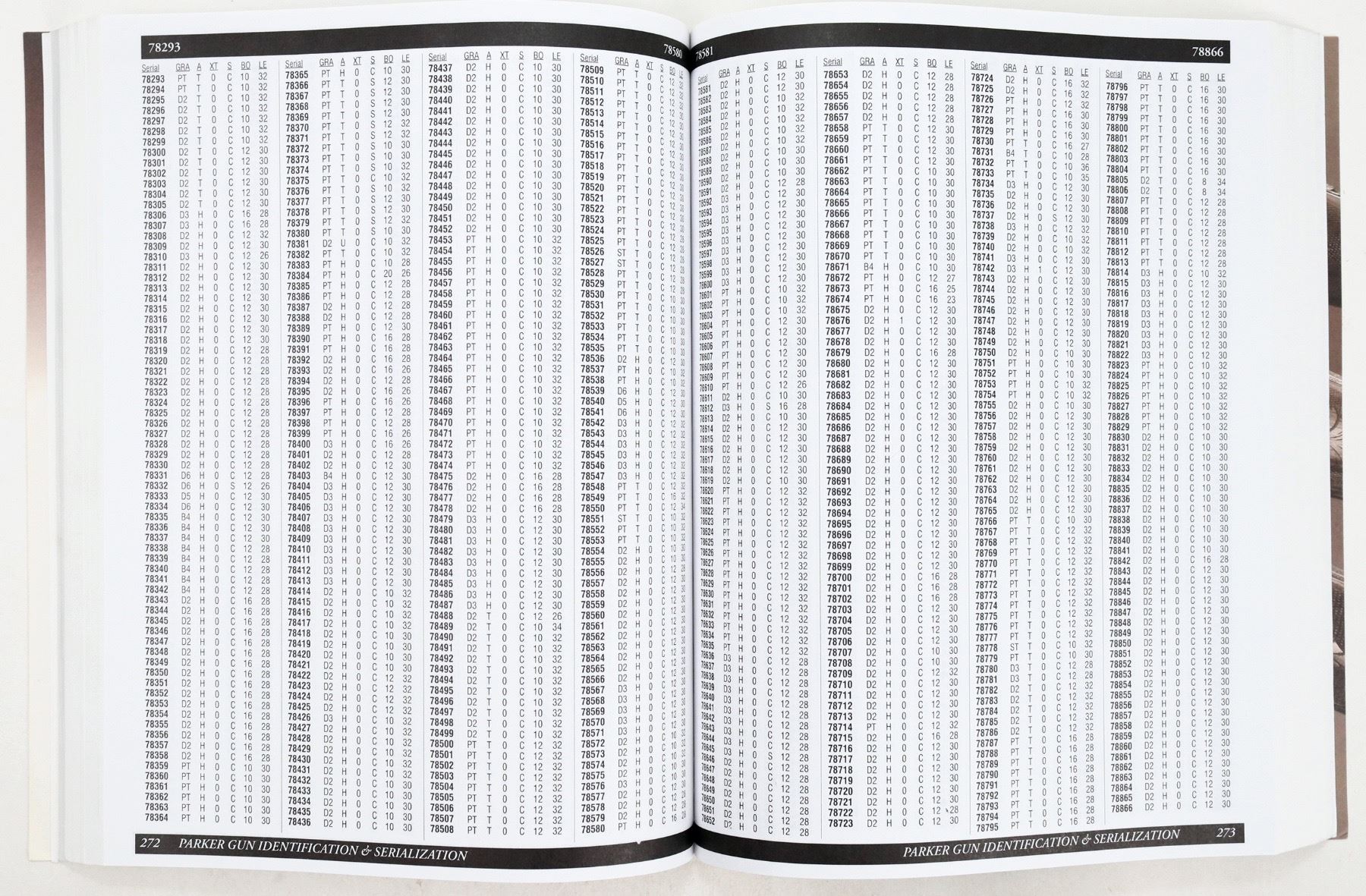 If you collect, or own just one Parker Shotgun, you need this book. At pp.605 you will identify every Parker shotgun made. You will start by serial number look-up and learn the Parker codes and options from the water-tables of the gun. It is fully illustrated to help with identification. This is the only Parker book with production numbers and options for (arguably) the best made shotgun in the United States. In like new condition, no foxing, second edition 2007.