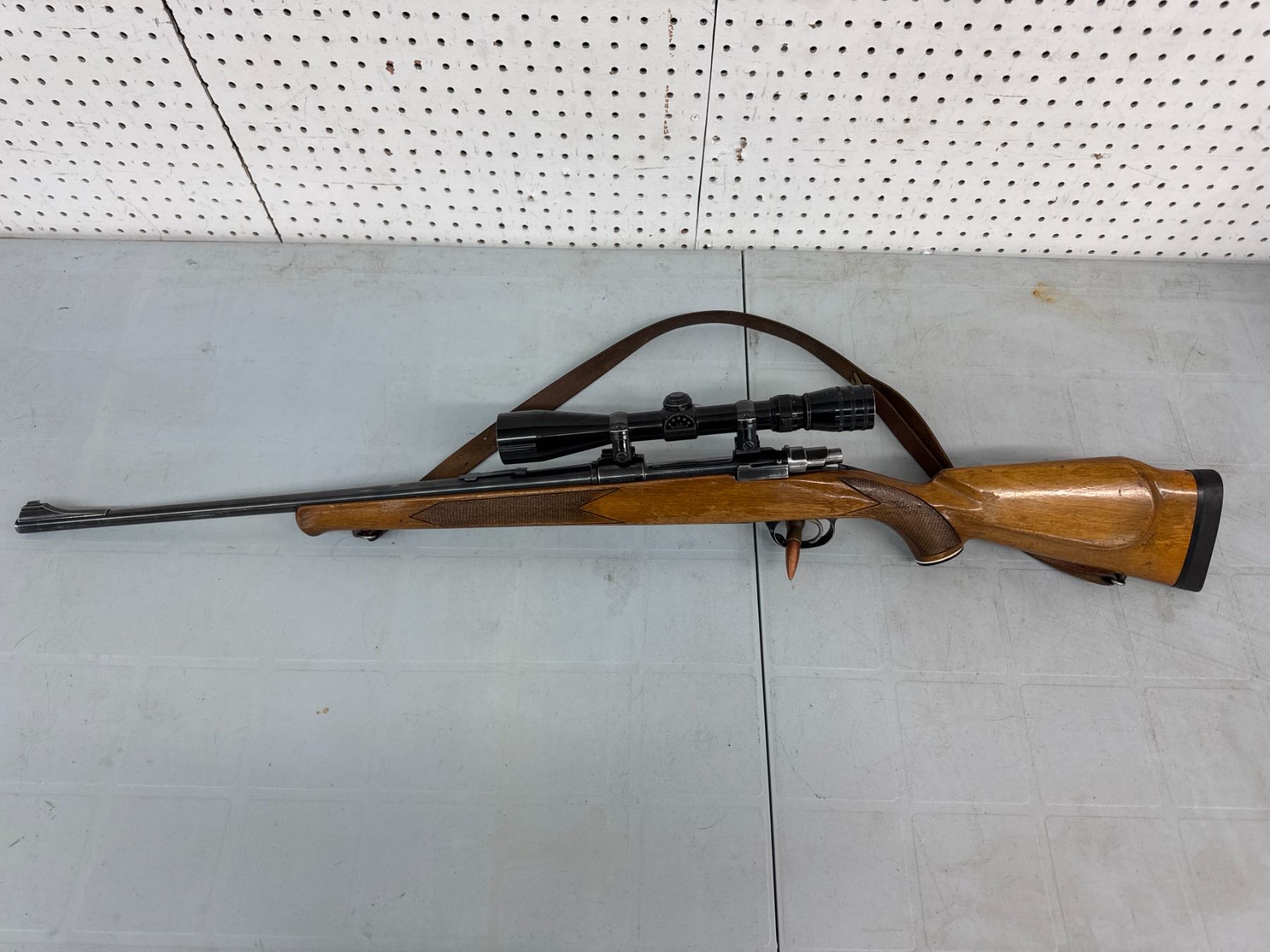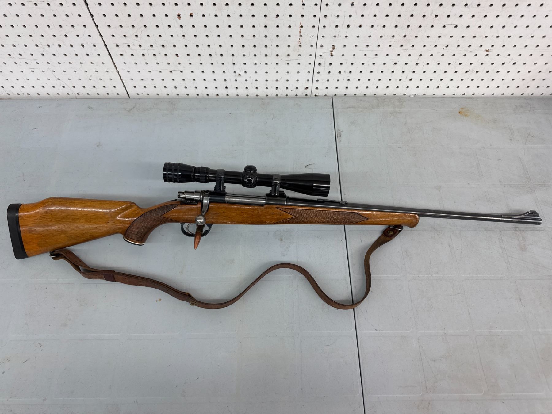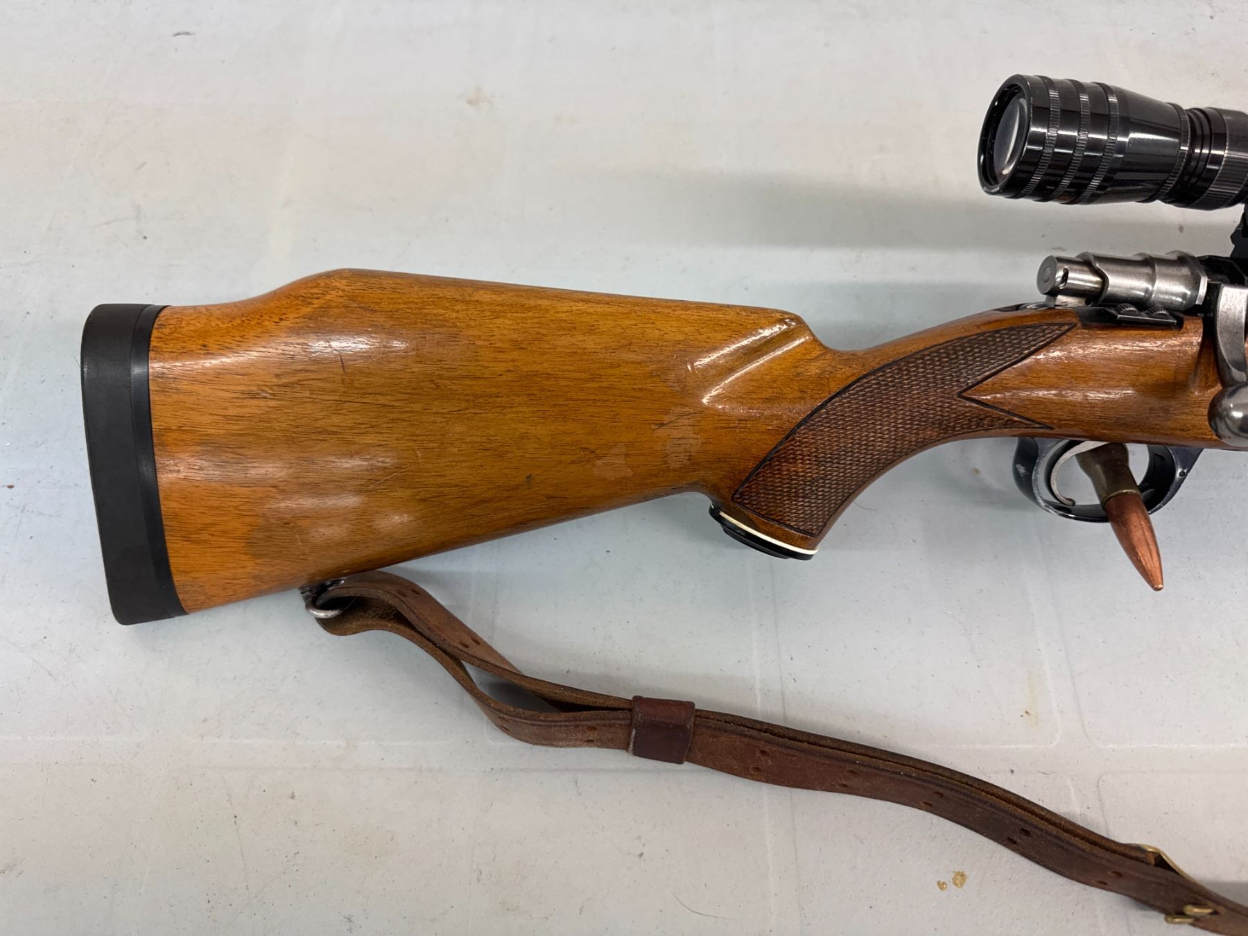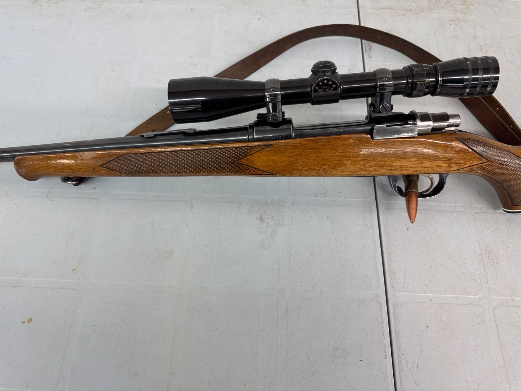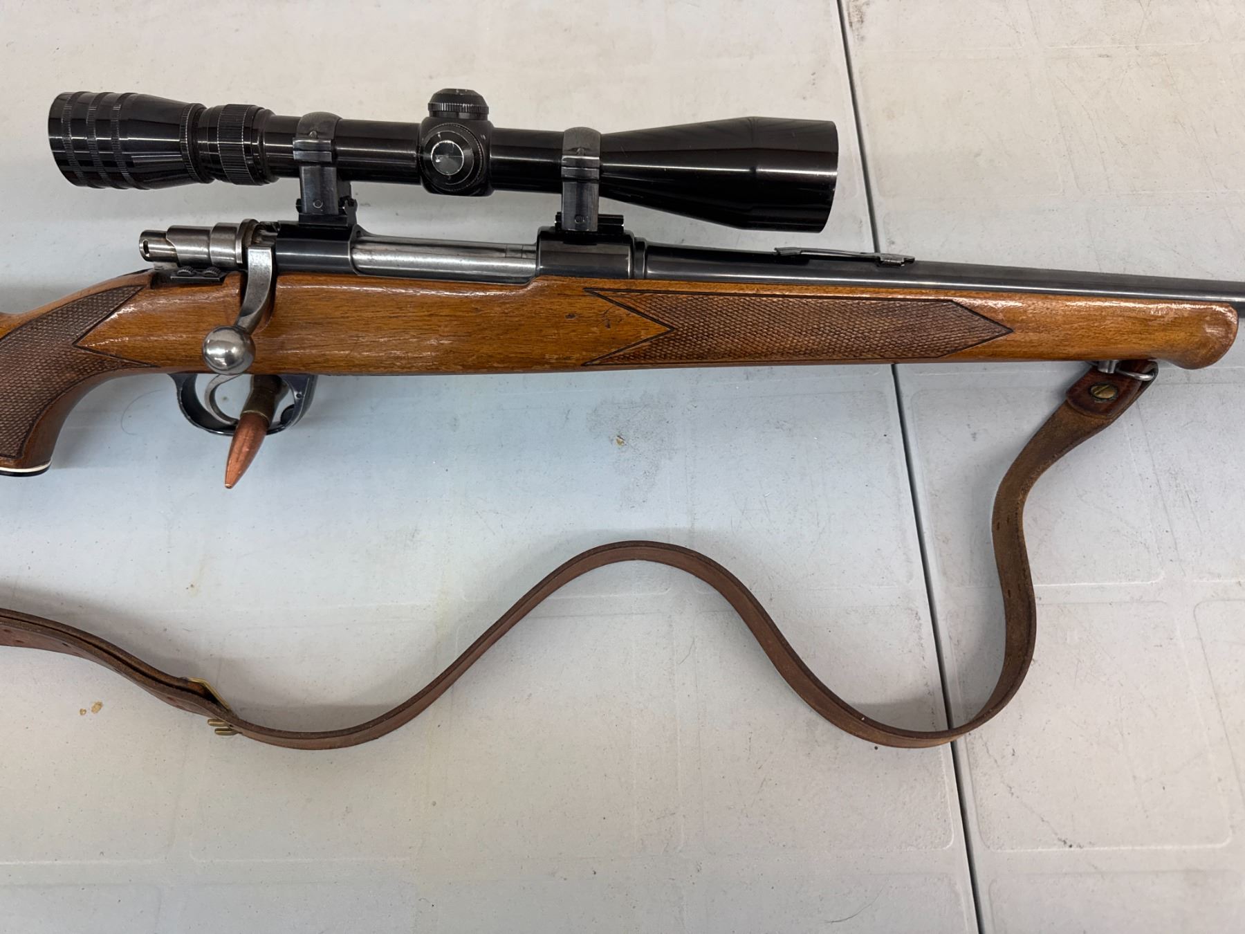 bolt action. Retains approx 40% of its original finish. action functions smoothly.Bore is bright and shiny. Stocks are in nice used condition with no cracks, chips or repairs. Comes with leather sling and redfield 3-9x40 scope. (k17 -9)