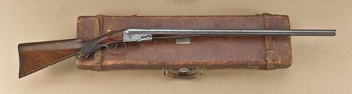 Parker P-grade 12ga side-by-side shotgun, with carrying case, serial #71387. The gun shows factory 30-1/8” Damascus barrels, which are choked Cylinder (right) and Modified (left). Double triggers, standard extractors. The barrels show 50-60% of their original finish and most of their original pattern, just some slight aging at high points and edges, good sharp barrel address, and very good plus bores. The frame shows a greypatina with faint traces of patina, some very bright case hardening on the interior of the action. The stock measures 14-3/8” to the end of the wood, 14-5/8” to the end of the original Parker buttplate. The gun showssplinter forend and checkered pistol grip with correct Parker grip cap. The stocks are good to very good with normal aging, small imperfections and use. The buttplate shows a couple of chips, at least very good for itsage. Along with a genuine to the period gun case with patent markings “69” on lock, of the type shown in The Parker Gun, page 156 #38, where it is described as ‘a seamless case’. The case contains rods, small