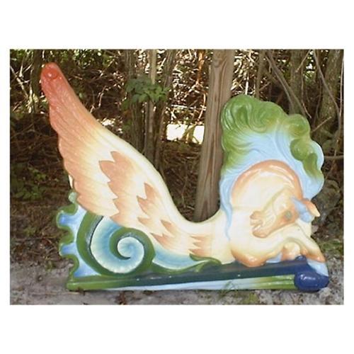 Parker Pegasus Chariot. This is a fiberglass side panel of a Chariot, Pegasus. Could make a great Farm or outdoor sign, or a child's headboard (what little girl would not love this). The horse has a beautiful flowing blue and green mane, yellow body with red-orange highlights on the wing or feather tips.<p>This piece came off an operating carousel in Denver when they changed the theme and moved the carousel.<p>