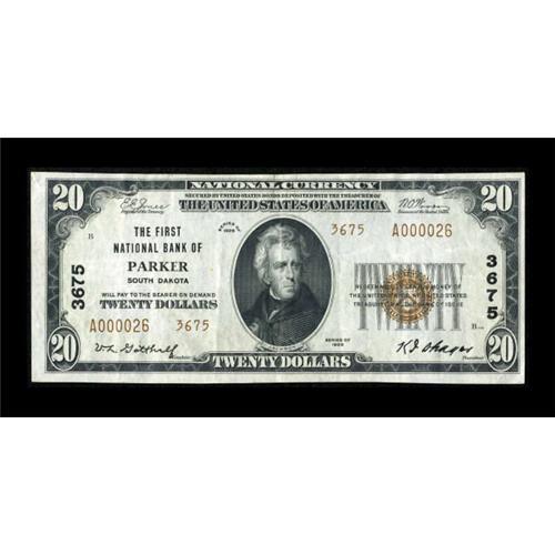 <B>Parker, SD</B></I> - $20 1929 Ty. 2 <B>The First NB</B></I> Ch. # 3675<BR> A rare type and denomination from this bank, with a total of just 60 Type 2 twenties issued. Bright <B>Very Fine-Extremely Fine, </B></I>with plenty of original embossing still visible. <BR><BR><b>Shipping:</b> Coins & Currency (<a target="_blank" href="http://www.heritageauctions.com/common/shipping.php">view shipping information</a>)