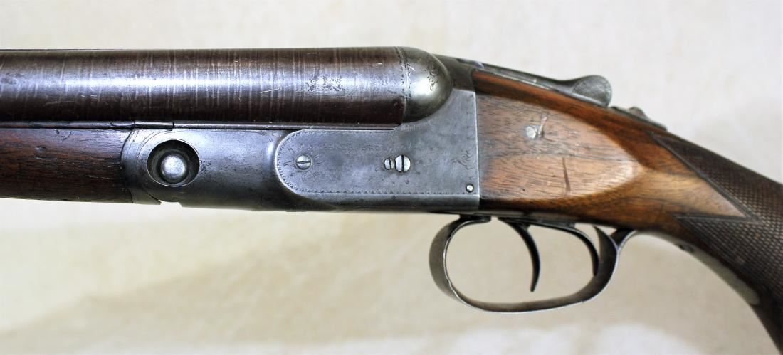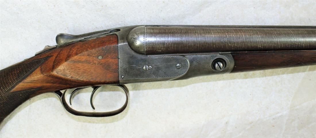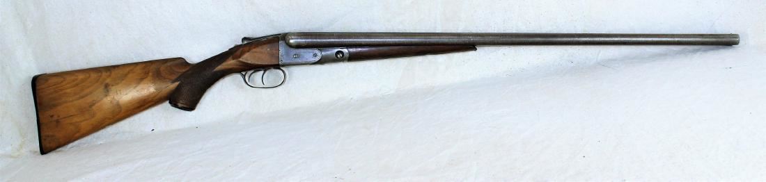Unusual double barrel hammerless shotgun in 16 guage, showing clean overall condition and damascus barrels.