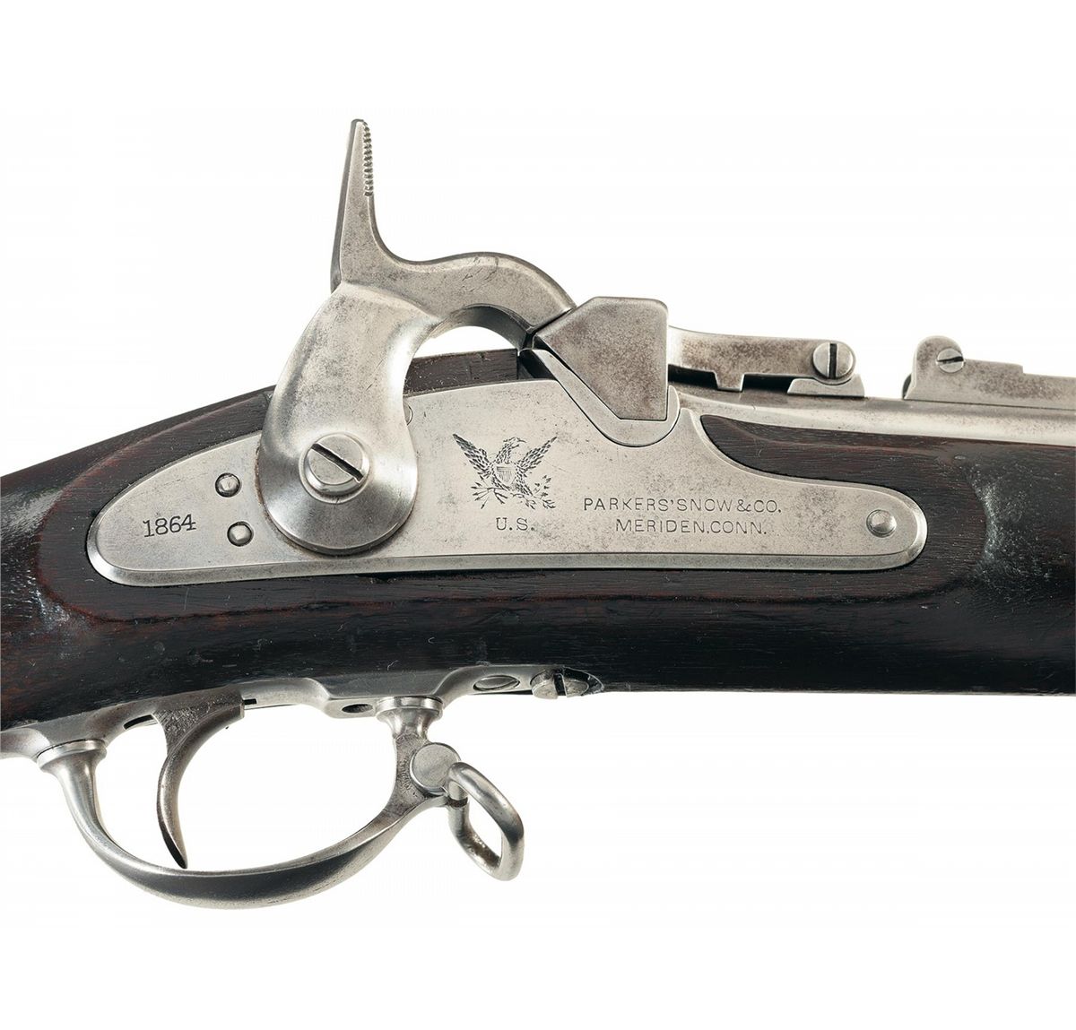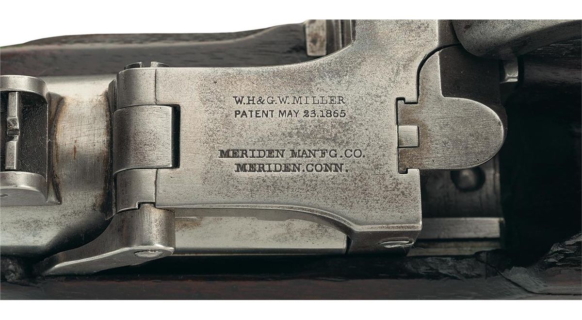 Originally manufactured in 1864, this Parker, Snow & Company Rifle was one of approximately 2,000 upgraded with the Miller breech loading system by Meriden Manufacturing circa 1865-1867. Blade front and 3-leaf rear sights, with the lock plate marked "1864" behind the hammer and "eagle/U.S." and "PARKERS' SNOW&CO./MERIDEN.CONN." ahead of the hammer and the rimfire breechblock marked "W.H. & G.W. MILLER/PATENT MAY 23, 1865/MERIDEN MAN'F'G. CO./MERIDEN, CONN." on top and "618" on the bottom. Smooth stock, with three "U" marked barrel bands, "GR" and "6" cut into the left side of the buttstock, and a smooth "U S" marked buttplate.