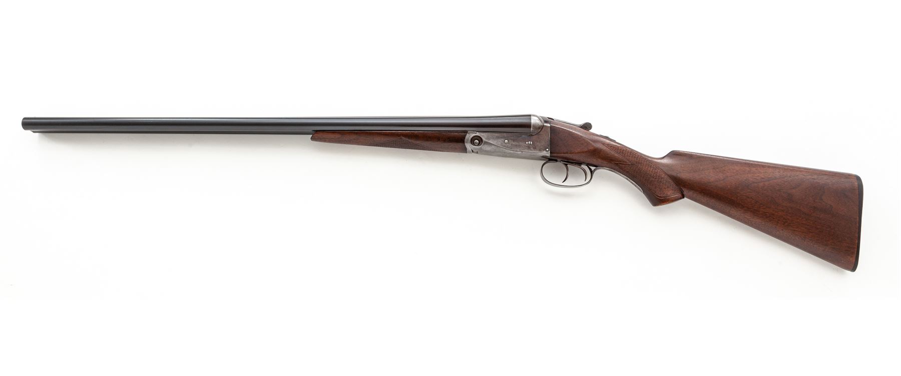 Parker Trojan Side-by-Side Shotgun, #178543. 16 ga. 26'' ''Trojan Steel'' barrels have 2-3/4'' chambers and are choked IC/Mod. Splinter forend and pistol-grip buttstock are of Field Grade walnut, with minimal checkering, no grip cap, and dog's head buttplate. Receiver has no engraving, and action features double triggers, auto safety and plain extractors. Mfg'd 1918. Condition is very good, with approx. 5% case color and 95% barrel blue remaining; few handling marks to wood. Very tight lockup, crisp action and very good bores. Est.: $600-$800. (C&R)