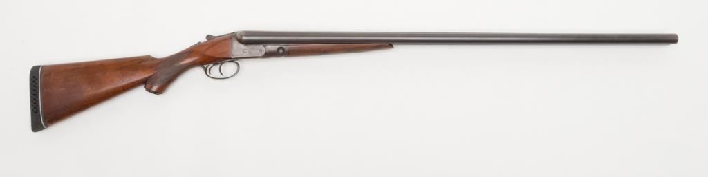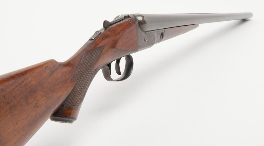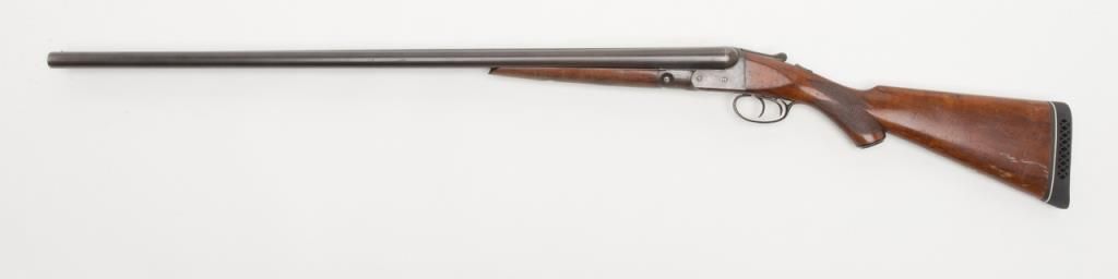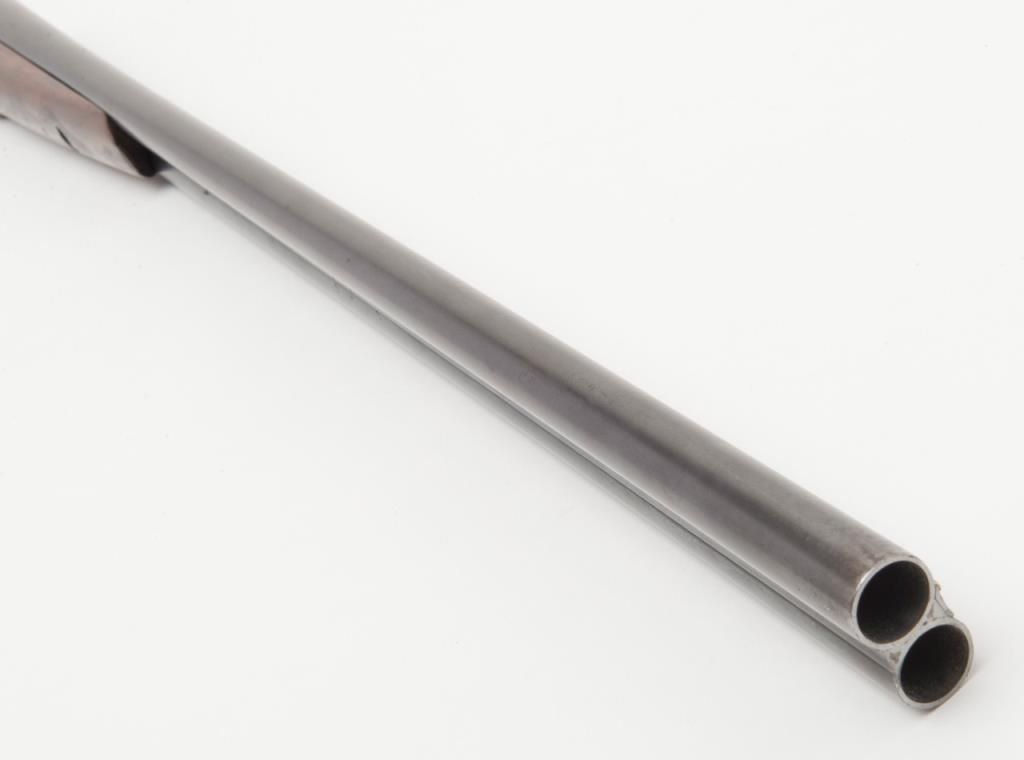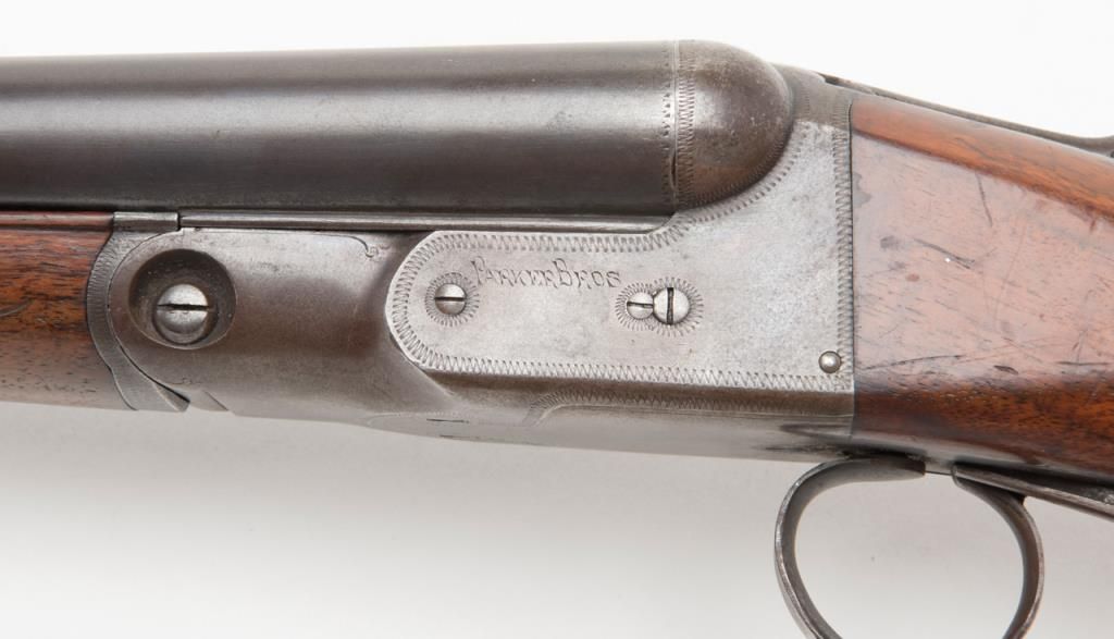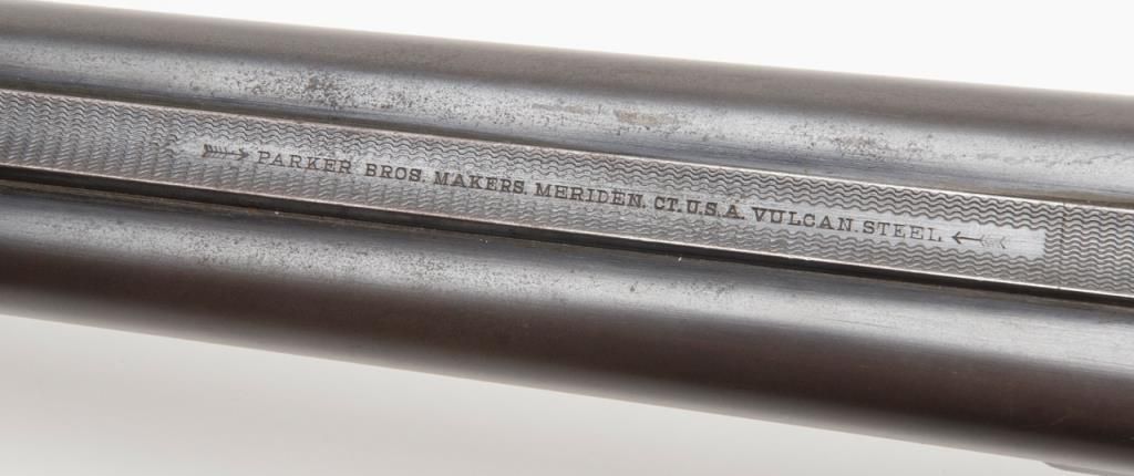 Parker VHE grade 12 gauge shotgun with 32” barrels remaining in good to very good condition, serial number 214887. The barrels show 50%-70% original blue turning to patina and slightly thinning on the edges. The frame shows strong traces of casehardening in protected areas also going to a natural un-cleaned dark patina. The stocks are good with many small storage scratches and slight wear to checkering with minor mars and a hard rubber recoil pad has been added. The stockmeasures 13 1/4” to the end of the wood and 14 ¼” to the end of the rubber pad. The action locks tight and the bores are near excellent. The gun is choked modified right and between full and improved modified left. The ejectors work well and overall a very serviceable and collectable Parker with considerable original finish. Est.: $1400-$2800
