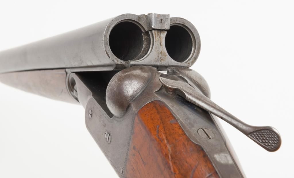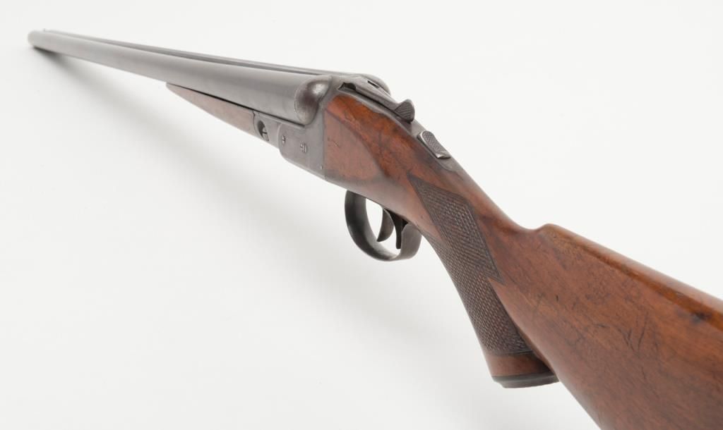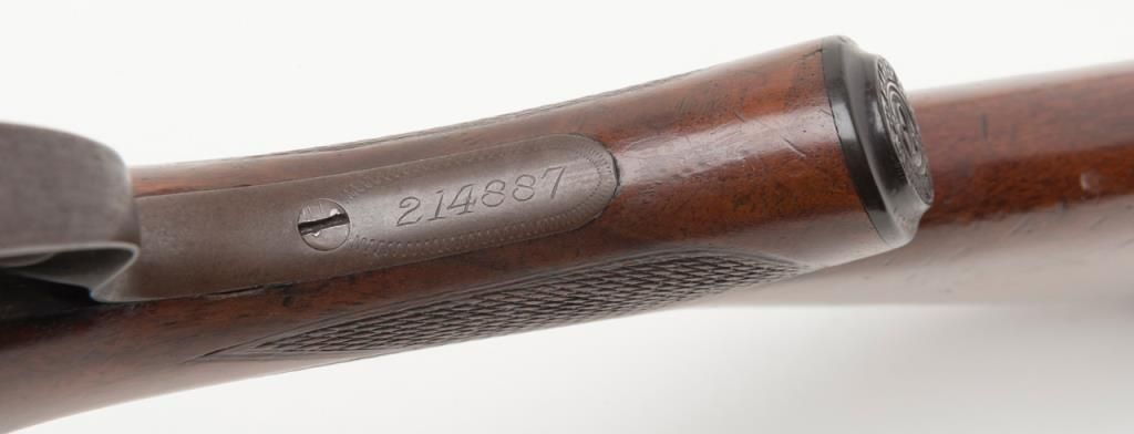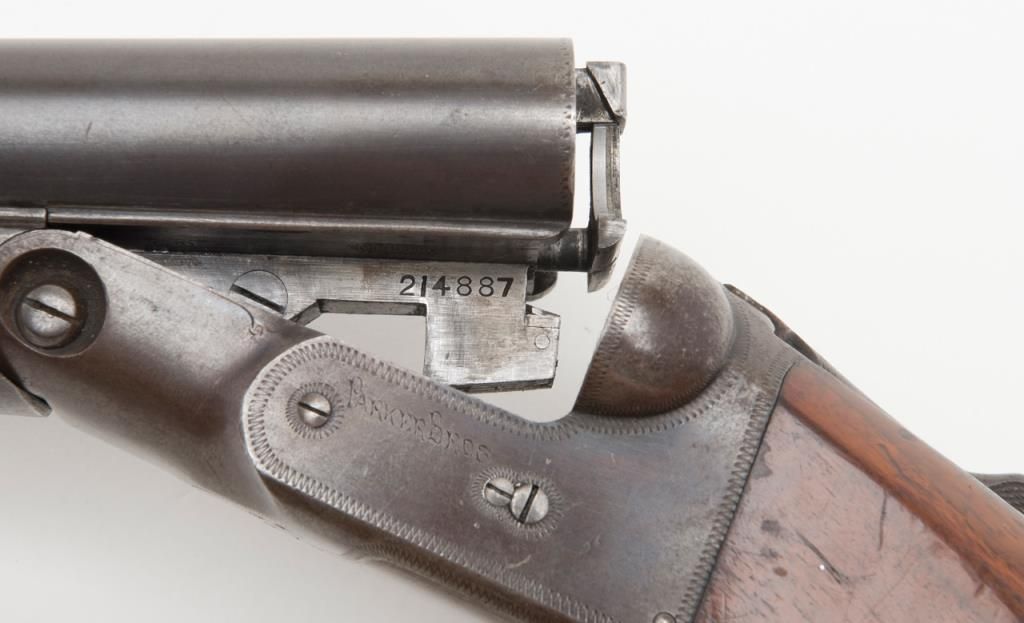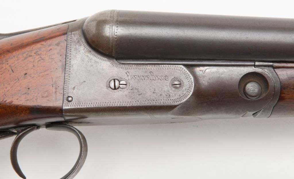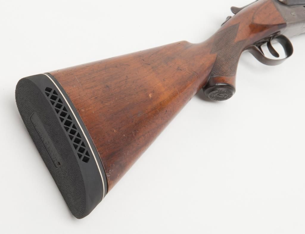 Parker VHE grade 12 gauge shotgun with 32” barrels remaining in good to very good condition, serial number 214887. The barrels show 50%-70% original blue turning to patina and slightly thinning on the edges. The frame shows strong traces of casehardening in protected areas also going to a natural un-cleaned dark patina. The stocks are good with many small storage scratches and slight wear to checkering with minor mars and a hard rubber recoil pad has been added. The stockmeasures 13 1/4” to the end of the wood and 14 ¼” to the end of the rubber pad. The action locks tight and the bores are near excellent. The gun is choked modified right and between full and improved modified left. The ejectors work well and overall a very serviceable and collectable Parker with considerable original finish. Est.: $1400-$2800