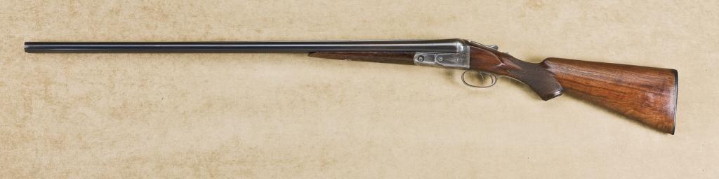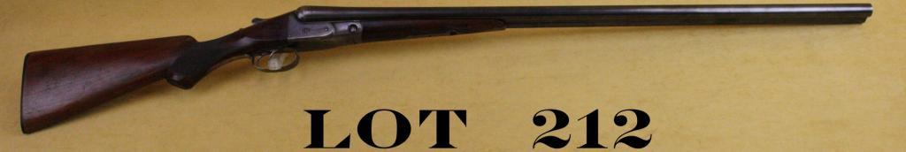 Parker VHE-grade 12ga double-barrel shotgun, 32” barrels, double triggers, auto-ejectors, serial number “147902”. The barrels show approx. 75-80% original toning blue finish with some minor scratches, even losses, andjust starting minor aging. The frame shows 30-60% original thinning toning case hardened colors with some faint areas of rainbow colors showing in the patina, particularly in the tang beneath the lever and bottom sideof frame. The left barrel is marked “JG” in a circle, the right barrel is marked “V” in a circle, the initials “HT/A”, a large “4” a small “2”. The rear lug is marked “12” for 12ga and “2” for size of frame. The stocksare in good original condition with slight wear to the checkering to the forend, some minor dings mars, scratches, normal carry and use. The wood measures its full original length and shows correct parker grip cap andbutt plate. The action is tight, the bores are bright. There is an old tag attached to the trigger guard which reads, “Full and full choke. Manufactured 1907.” Est.: $2,500-$4,000