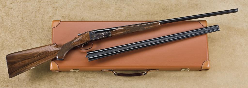 Parker new production series DHE grade 28ga two-barrel set. Excellent to new in original case with canvas cover. Serial number “28-3669”. The gun shows the O-size or light weight frame with first set of barrels 28” choked full and mod. Second set of barrels, 26” choked mod and improved cylinder. The gun shows fine quality engraving, single trigger, auto ejector, checkered butt with skeleton butt plate. Very near new, 99% plus, no evidence of firing. Now out of production approx. 20 years, these new series Parkers are fast gaining value and two-barrel 28ga sets were always rare and hard to obtain. Est.: $5,000-$8,000.