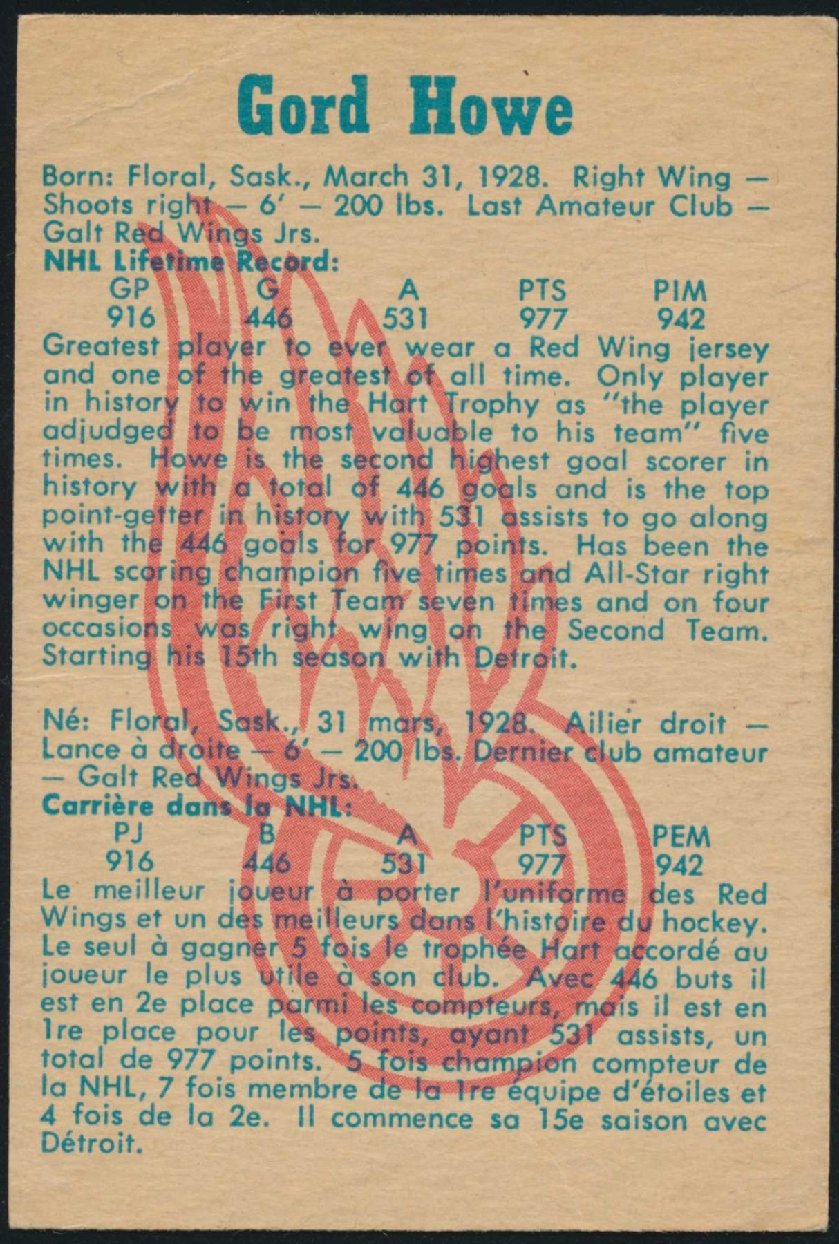 Parkhurst Card from Gordie Howe #9 (1961-62) card # 20.