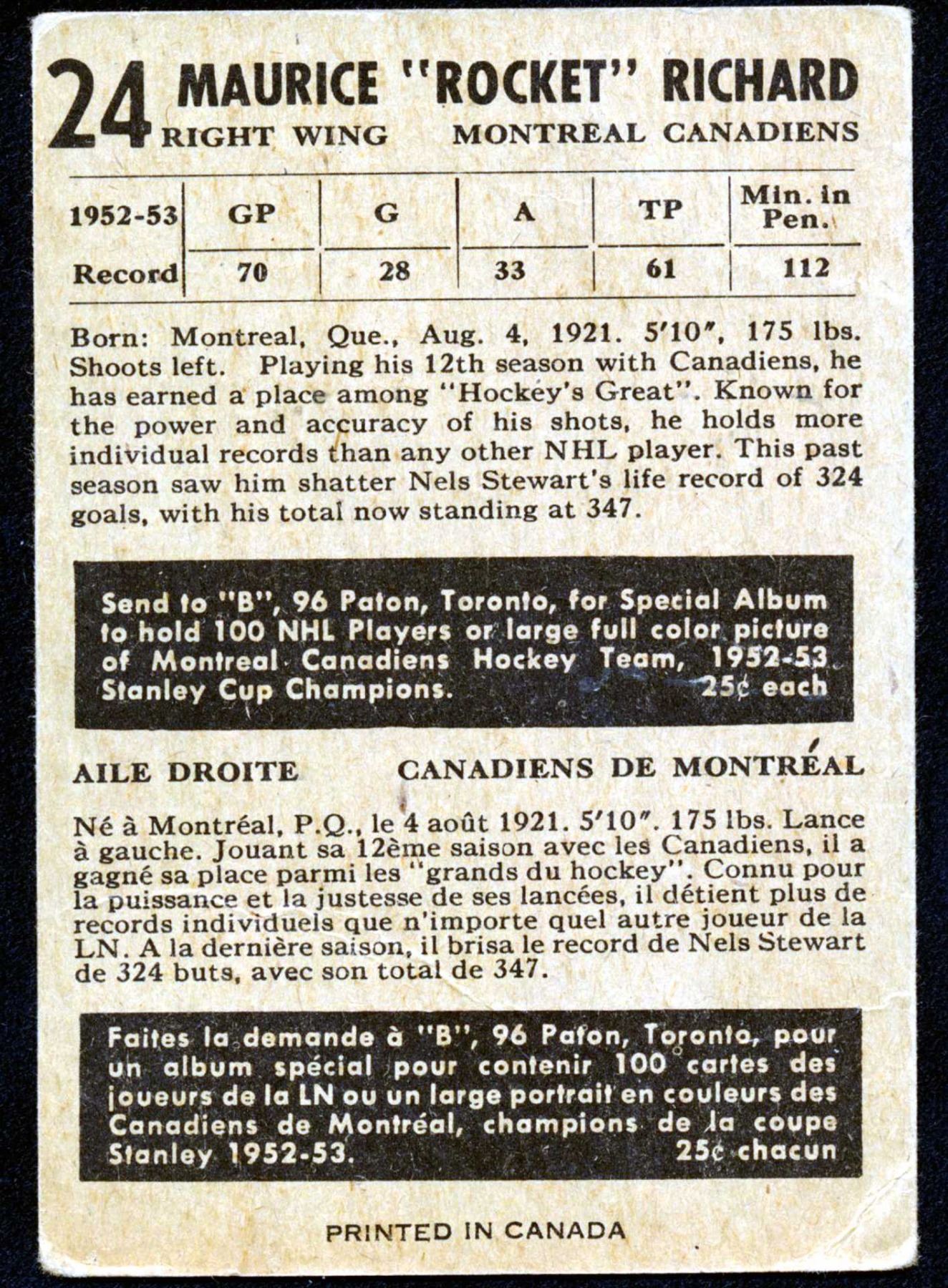 Parkhurst card from Maurice Richard #9 (1953-54) card #24.