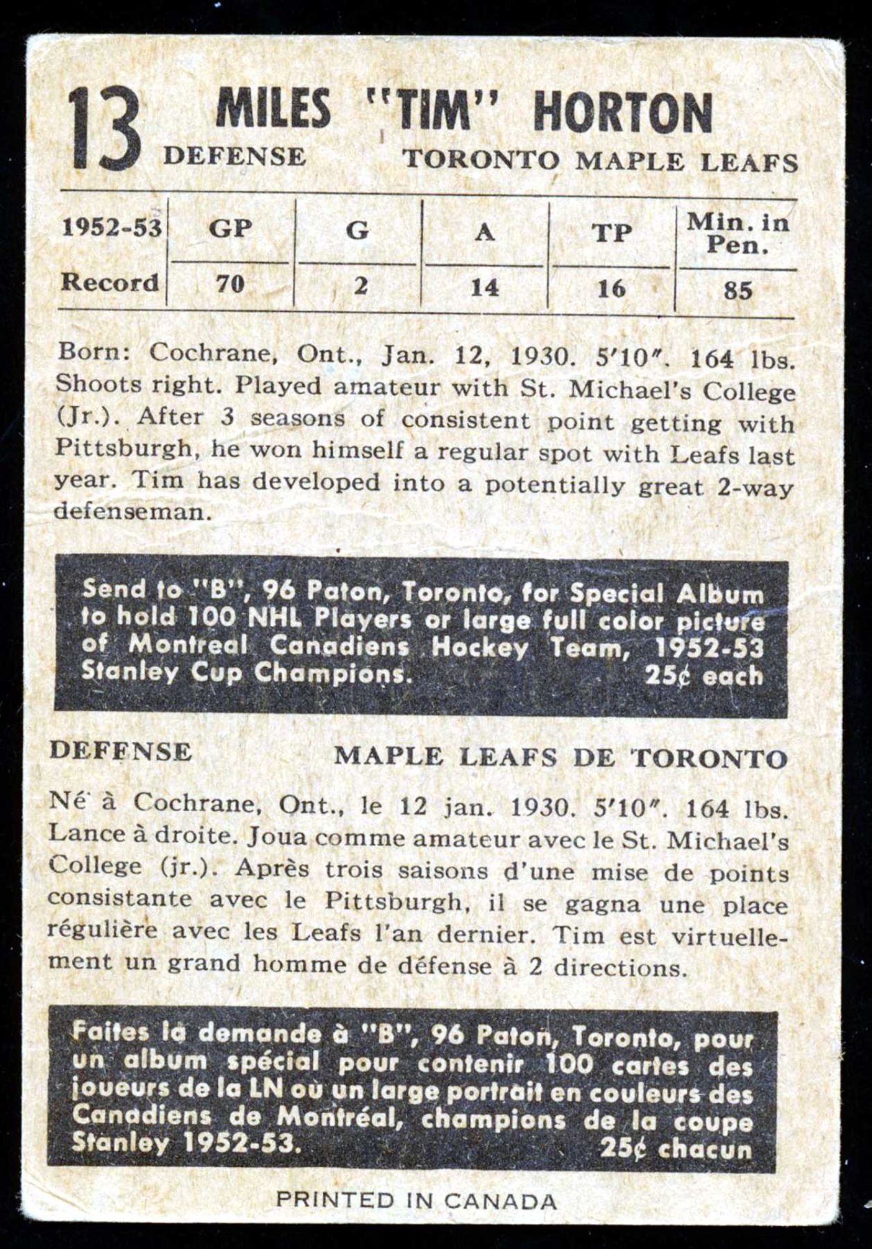 Parkhurst card from Tim Horton #7 (1953-54) Card # 13.