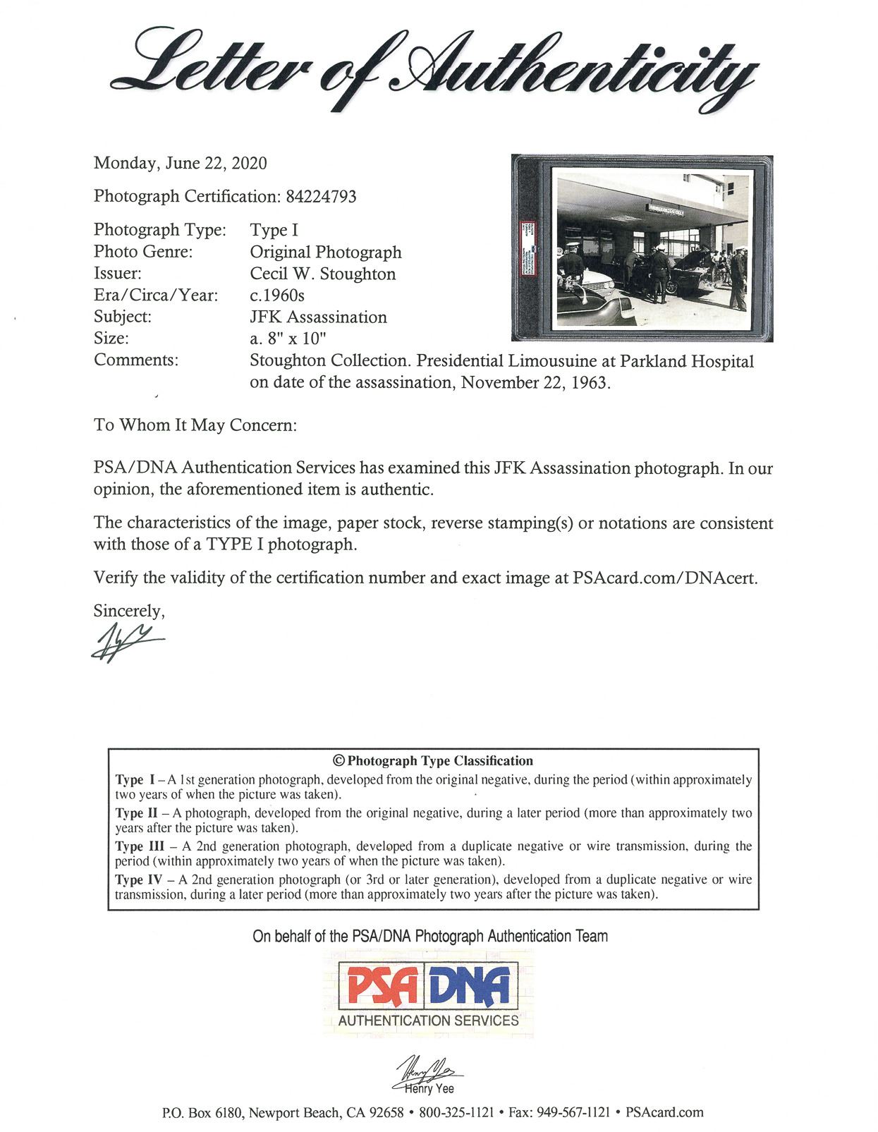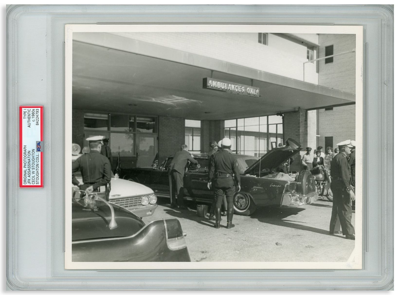 Original 10'' x 8'' photograph of John F. Kennedy's presidential limousine shortly after it arrived at Parkland Hospital in Dallas, where the President was taken after he was shot. Taken by White House photographer Cecil W. Stoughton, photo is encapsulated by PSA, identifying it as a Type I photo, from the original negative, developed shortly after the photo was taken. Near fine condition.