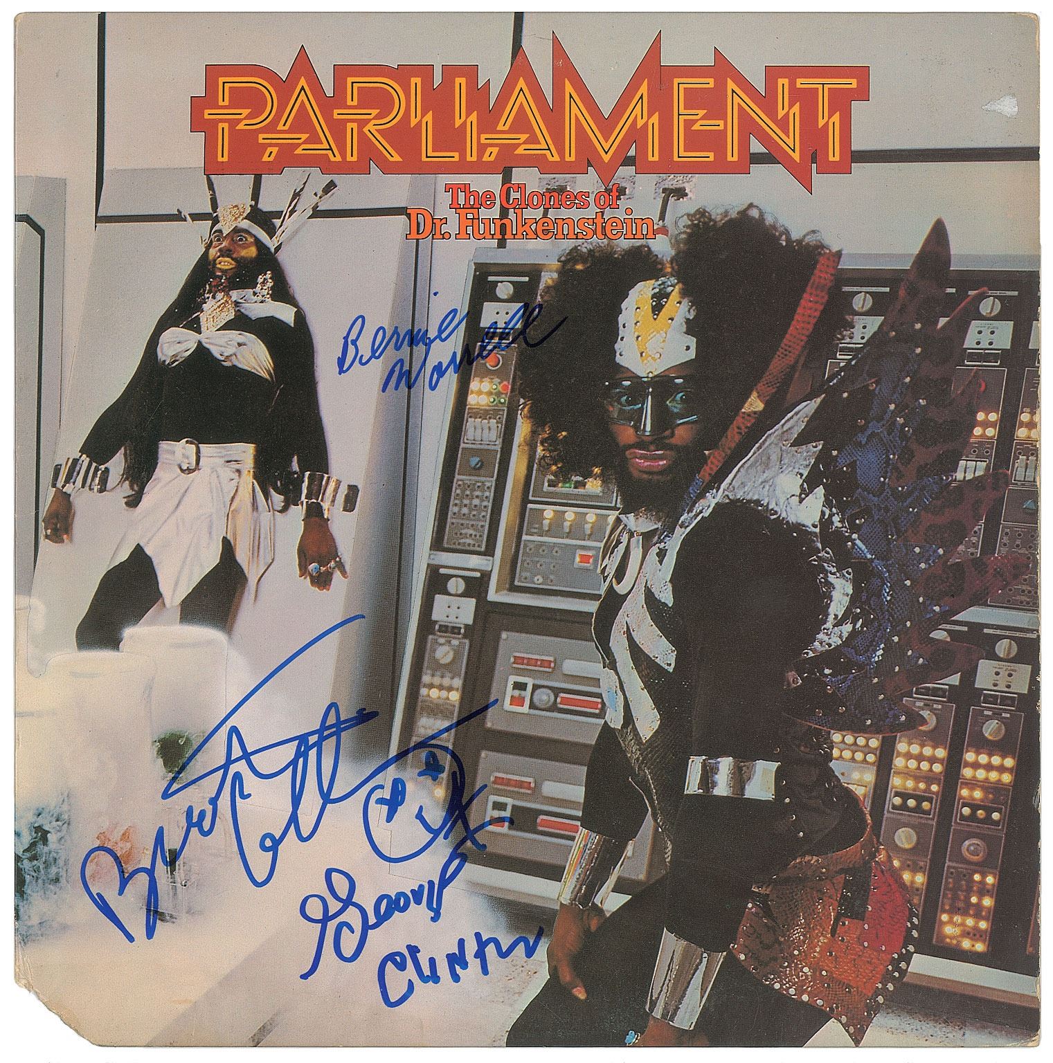The Clones of Dr. Funkenstein album signed on the front cover in blue felt tip by George Clinton, Bernie Worrell, and Bootsy Collins. In fine condition, with a clipped lower left corner, and some old price sticker residue. The record is not included.