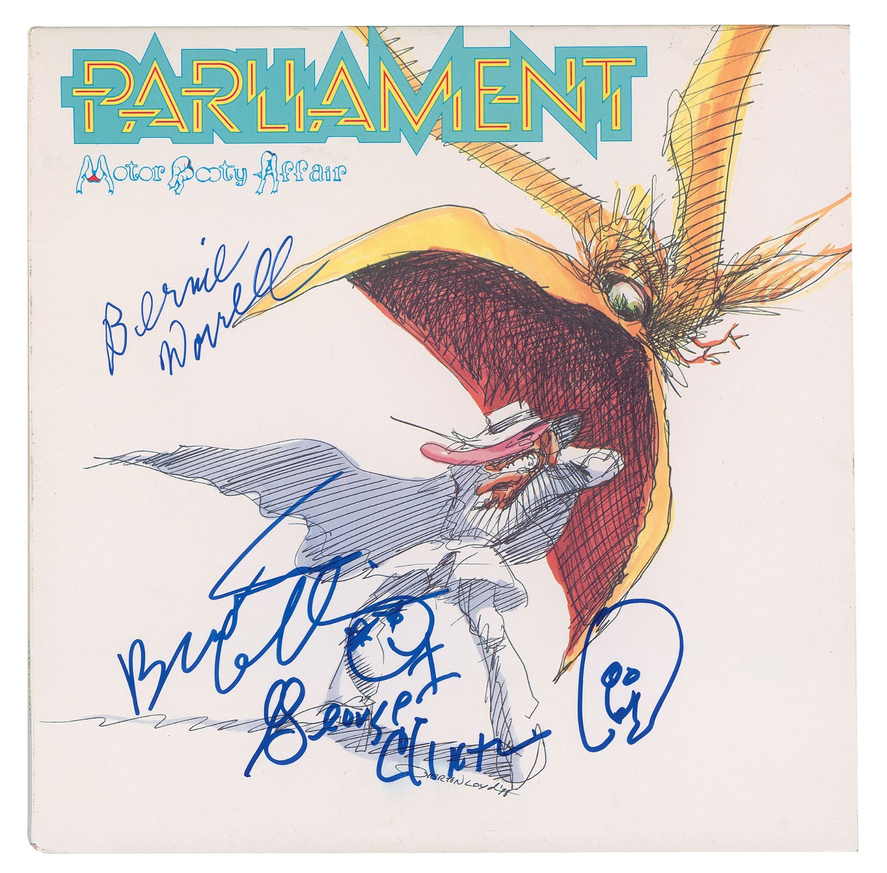 Motor Booty Affair album signed on the front cover in blue felt tip by George Clinton, Bernie Worrell, and Bootsy Collins. In fine condition. The record is included.