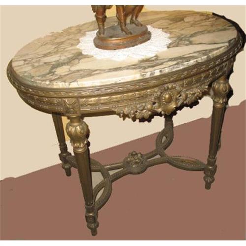 Beautiful marble on handsome gesso covered carved wood. Ornate skirt and stretcher. Fluted columns. Acanthus leaves. A wonderful find.