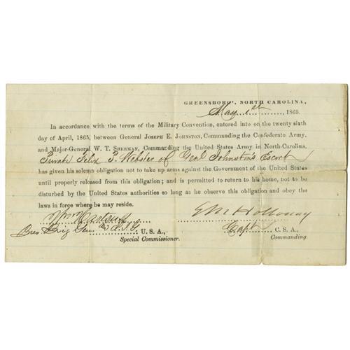 <B>Parole of Confederate Private Felix P. Webster of 'General Johnston's Escort';</B></I> Private Felix P. Webster was member of a little-known unit called simply 'Holloway's Cavalry', alternatively called the Crocheran Light Dragoons, Captain Smith's Escort Company, and Holloway's Light Dragoons. They were formed especially to escort Confederate generals during the Civil War. <BR><BR>Assigned to General Joseph E. Johnston as his personal escort in February 1865, Private Webster was with Johnston as he fought his way through the Carolina Campaign and was at General Johnston's surrender to General William T. Sherman on April 26, 1865, as evidenced by this unique parole document executed on that date. <BR><BR>Felix P. Webster was born in Alabama in 1846 and was a 19-year-old private riding with Holloway's Cavalry when the surrender occurred at Greensboro, North Carolina. This document measures approximately 8” x 4” and reads in part: "<I>Private Felix P. Webster of General Johnston's Escort has given his solemn obligation not to take up arms against the Government of the United States…and is permitted to return to his home...</B></I>" <BR><BR>The document is dated May 1, 1865 and is signed by Brevet General William Hartsuff of the Union Army with "Greensboro, North Carolina" at the top. It is in very good condition with four fold marks and is pre-printed on lined paper except for the date, Private Webster's name, and the signatures. <BR><BR>Private Webster went on to become a successful cotton merchant, moved to Dallas, Texas, and died in 1914 while on business in Rotterdam, Holland. This is a rare and interesting document from an obscure unit that guarded Confederate generals, especially General Joseph E. Johnston in one the great events at the end of the war.<BR><BR><b>Shipping:</b> Flat Material, Small (<a target="_blank" href="http://www.heritageauctions.com/common/shipping.php">view shipping information</a>)