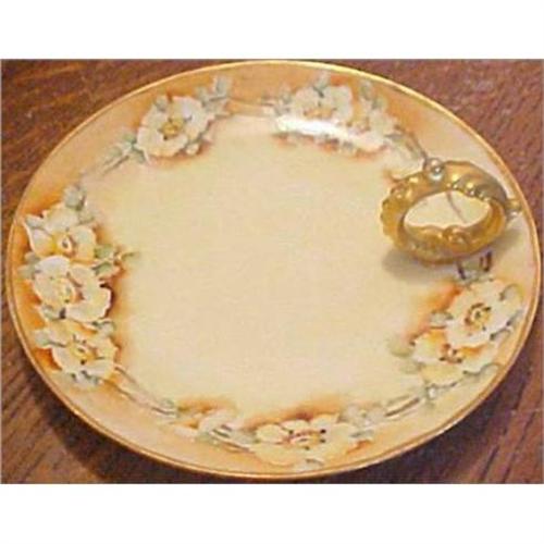 Superbly painted ring handled Limoges porcelain dish from Paroutaud Freres (P.P, La Seynie factory, is superb in it's hand painted artistry. Would look fabulous on your vanity or as a regal accent piece.<BR><BR>Exquisite Anemones in rich golden hues of yellow, accented with Umber, Green and Gold on a Buttercream ground with heavy gilded rim. Top it off with the French Scroll & Feather Ring Handle gilded with a rich burnished gold and you have a terrific example of the fine painted porcelain that would please even Marie Antoinette. <BR><BR>Condition is rated excellent. The look is lavish and elegant. <BR><BR>Measures: 6.25 inch diameter with a 1.25 diameter detailed ring handle. Underglaze whiteware Mark #2 in green, "P and P" La Seynie. Circa 1902-1917.<BR><BR>