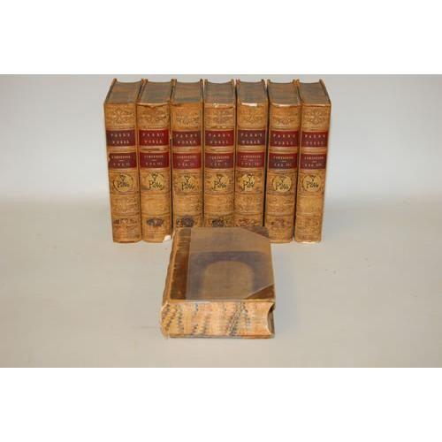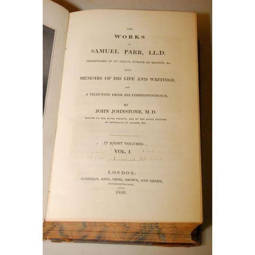 Parr / Johnstone. The Works of Samuel Parr - 8 Volumes. London: Longman, Hurst, Rees, Orme, Brown and Green, 1828. First Edition. 8vo - over 7¾" - 9¾" tall. Hard Cover. Ex-Library. Good Condition. With Memoirs of His Life and Writings, and a Selection from His Correspondence by John Johnstone. Bound in 3/4 leather & cloth, raised bands on spines, red leather spine labels on gilt decorated spines, all edges marbled, bindings tight. Engraved frontis in volumes 1, 2 & 7. One cover detached, covers show edge/corner wear, chipping to top/heel of backstrips, sunned.