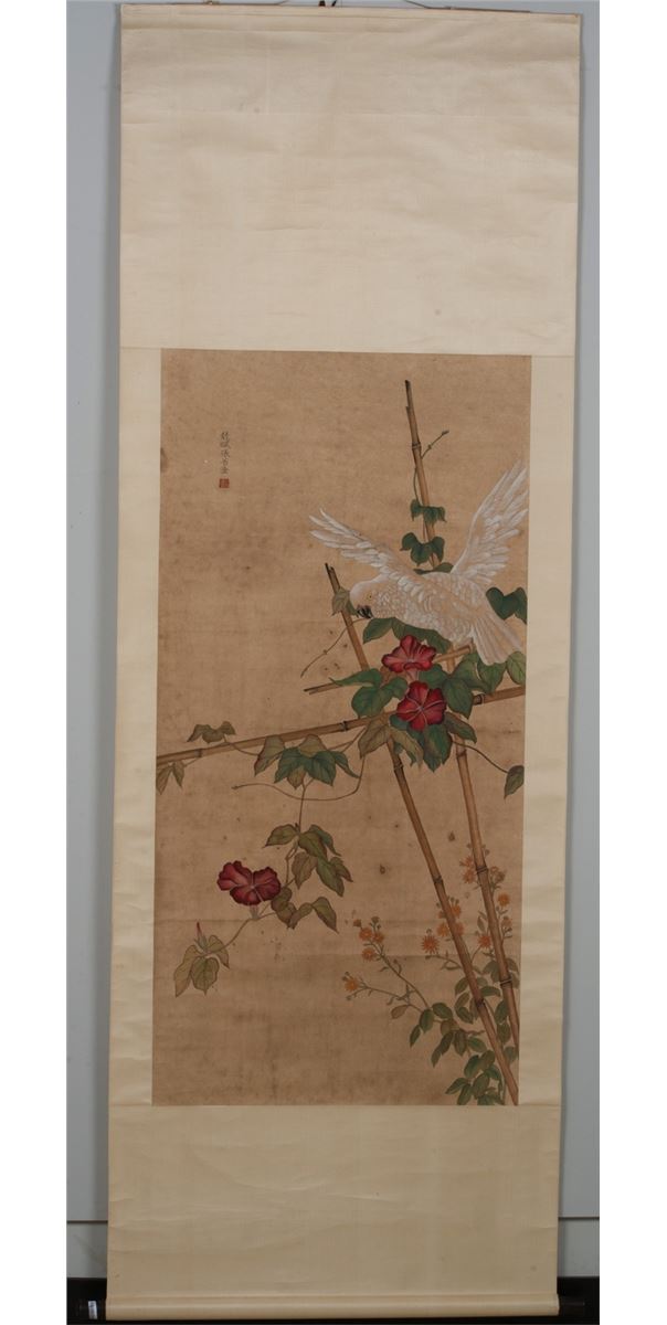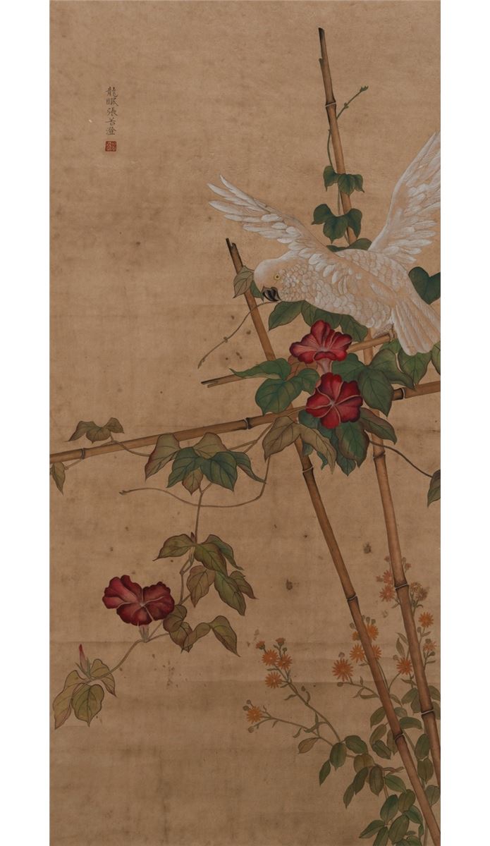 Parrot on bamboo scaffold, hanging scroll, Chinese ink and watercolour on paper, signed Zhang Ruo Cheng with one red seal. 132 cm x 63 cm. Provenance: T. Ng Collection Toronto.