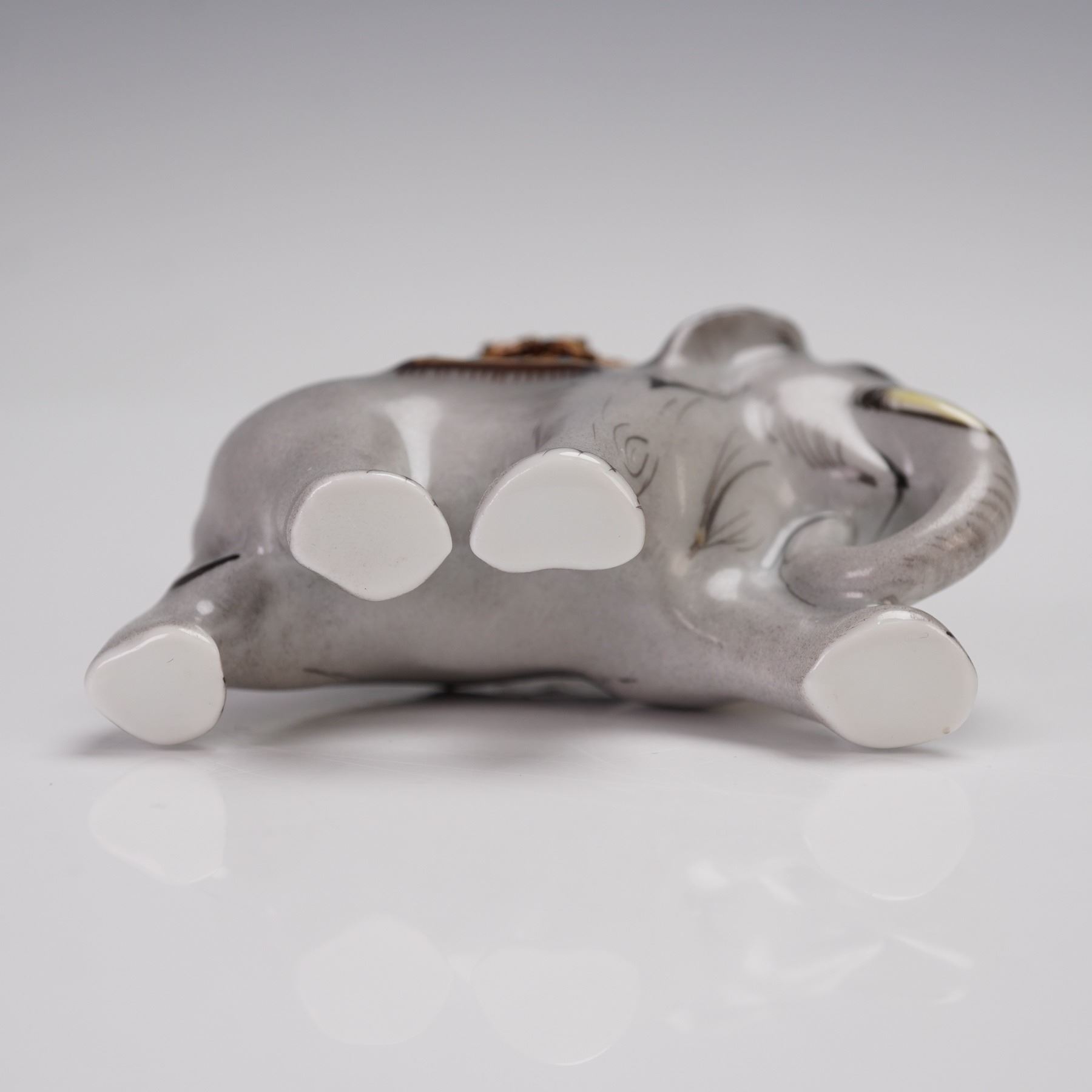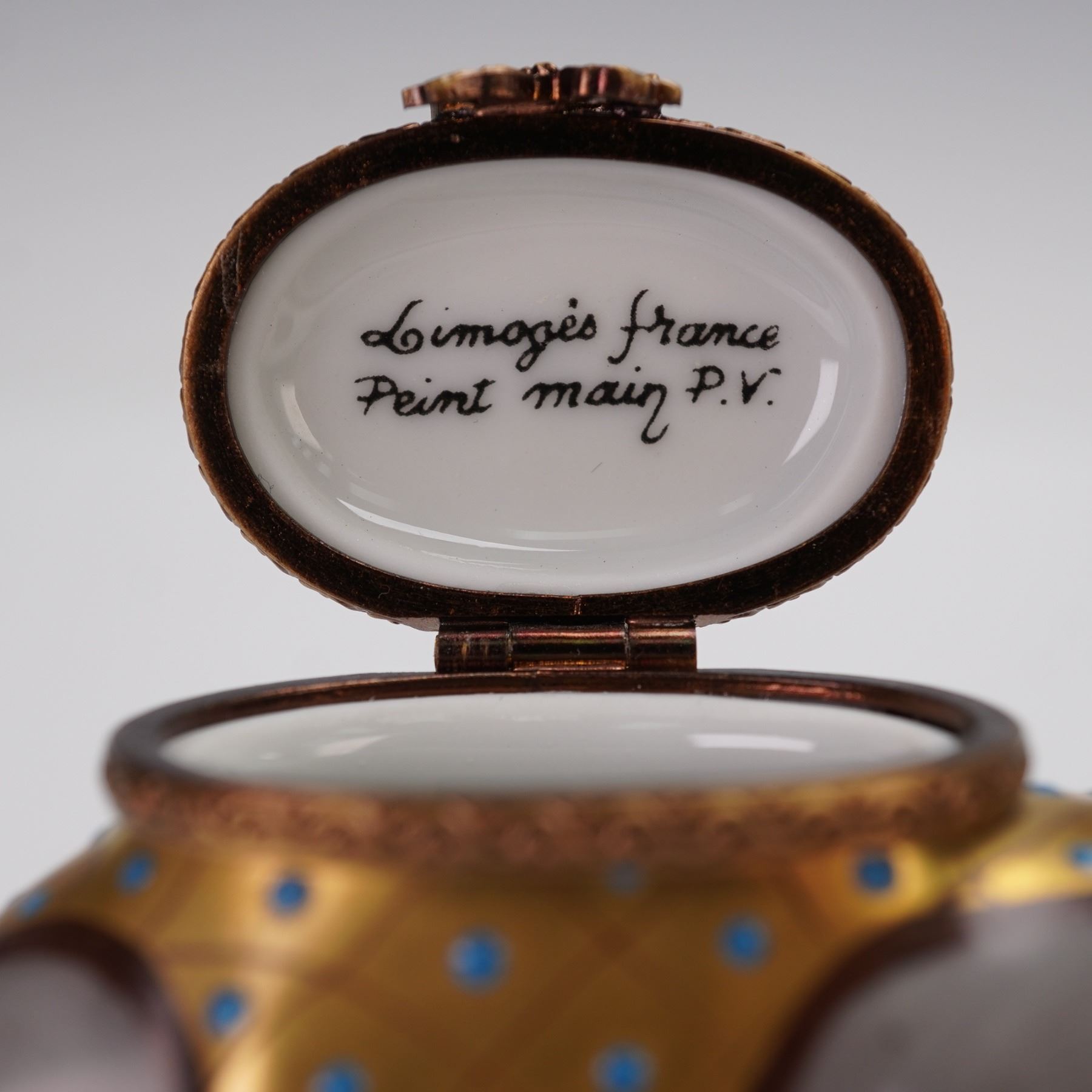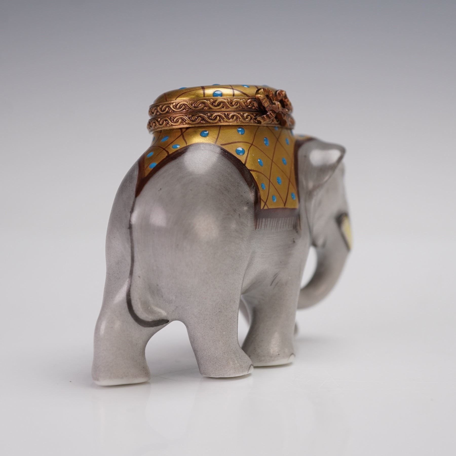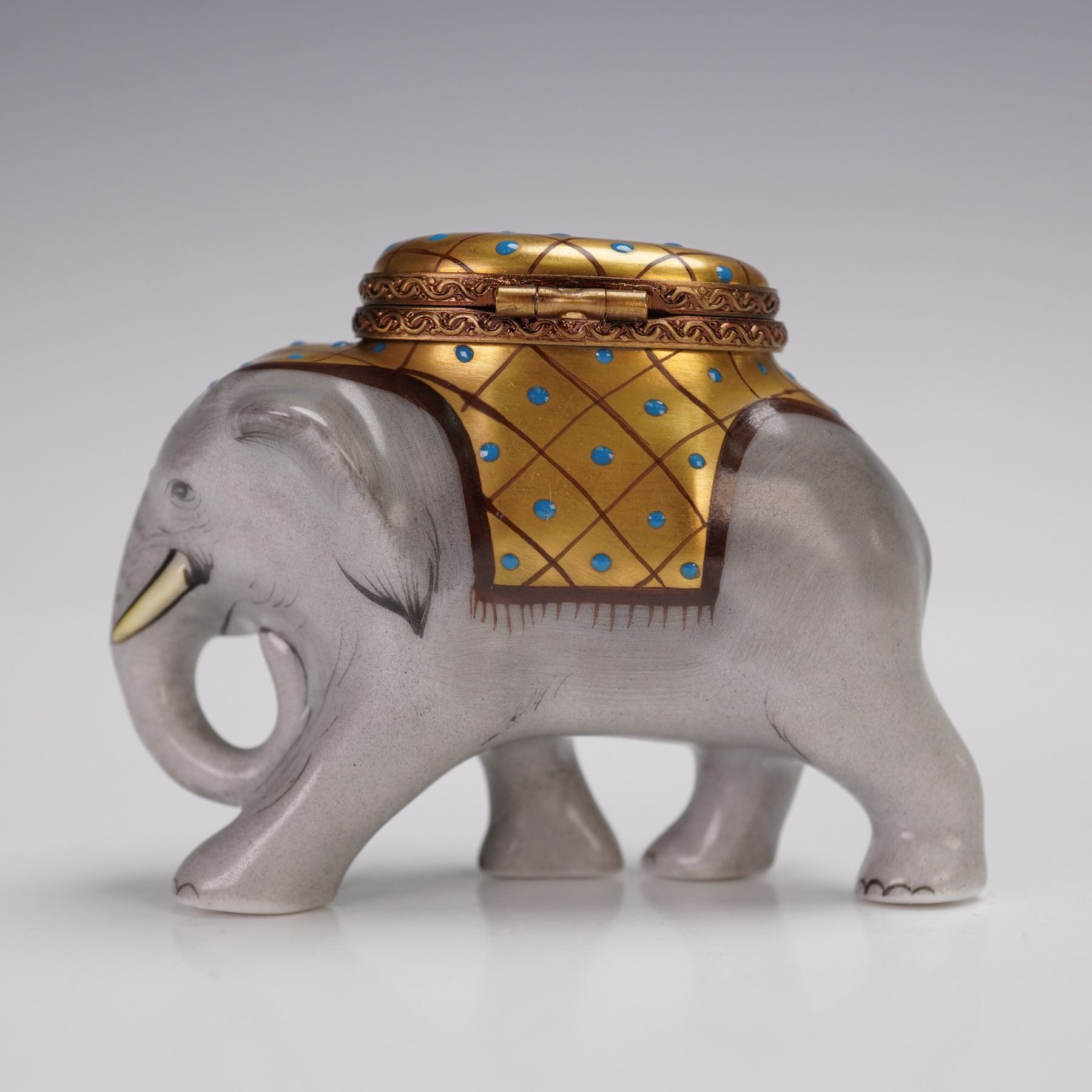 Porcelain hinged treasure box in the form of a parade elephant, finely hand-painted in shades of gray with expressive features, detailed tusks, and a curved trunk. The elephant is adorned with a gold saddle blanket decorated with a grid pattern and blue enamel dots, topped with an ornate gilt metal mount and clasp. The interior of the hinged lid is inscribed Limoges France Peint Main P.V.