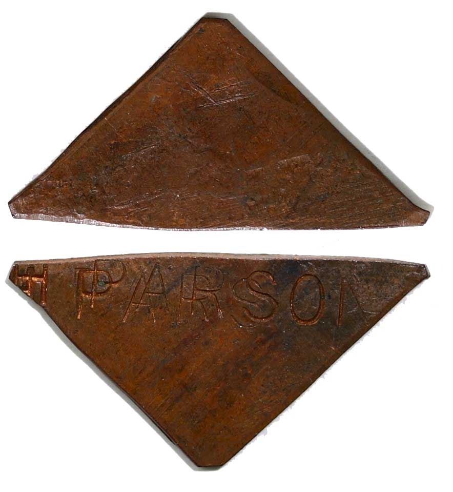 Parson's Token Gingras #240f/i PARSONS (doubled) (Copper) Rarity 10. Note the dimensions of this example seem to be a bit larger then the 240f but much smaller then the 240j as pictured in the Catalogue. Possible a new find. Dimensions 31mm x 16mm.