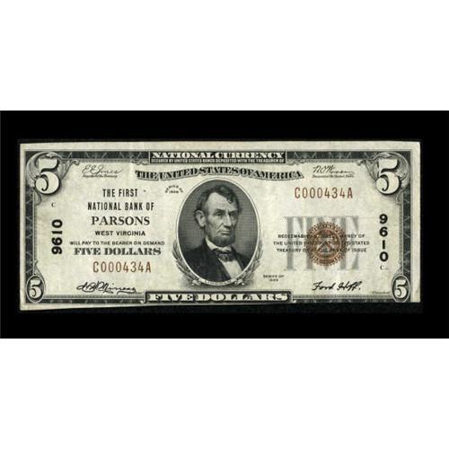 <B>Parsons, WV</B></I> - $5 1929 Ty. 1 <B>The First NB</B></I> Ch. # 9610<BR> This is a crisp representative from this Tucker County issuer. <B>Very Fine-Extremely Fine</B></I>.<BR><BR><b>Shipping:</b> Coins & Currency (<a target="_blank" href="http://www.heritageauctions.com/common/shipping.php">view shipping information</a>)