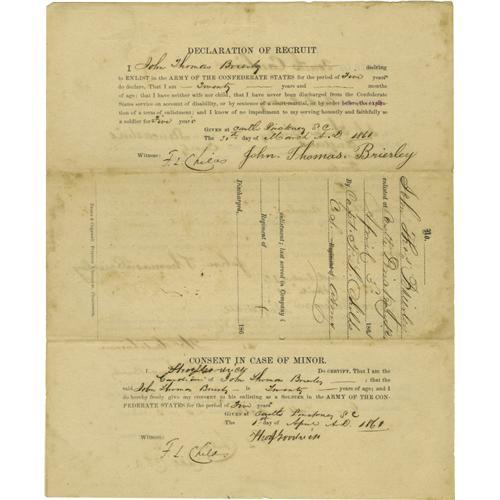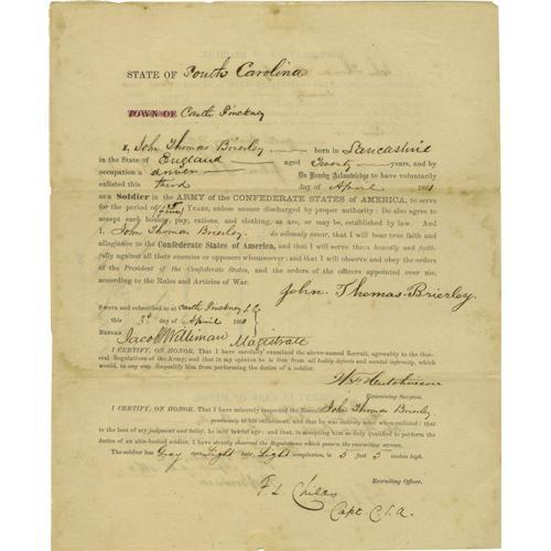 <B>Partially Printed Confederate Enlistment Certificate,</B></I> two pages, 8” x 9.5”, Charleston, South Carolina, April 3, 1861. English-born John Thomas Brierley, aged twenty, here enlists in the Confederate Army for a period of five years. The location of his enlistment is Castle Pinckney, an early 19th century fort that helped defend Charleston harbor. Assuming he was posted to this location, young Brierley would soon witness the bombardment of Fort Sumter and later play host to Yankee prisoners after First Manassas. Two smoothed folds, some damp stains. Fine condition. <BR><BR><b>Shipping:</b> Flat Material, Small (<a target="_blank" href="http://www.heritageauctions.com/common/shipping.php">view shipping information</a>)