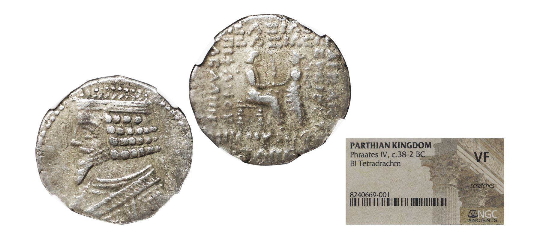 Parthian Empire, silver tetradrachm of Phraates IV (38-2 BC), dated 28x of Seleucid Era (around 25-20 BC), month of January (PERITIOU in Greek), MAC 584, Obv: Bearded bust of king, wearing diadem. Rev: In centre, king seated on throne receiving palm frond from goddess Tyche; Greek legend composed of titles and the date around Graded by NGC Ancients Very fine Scratches, Rare..