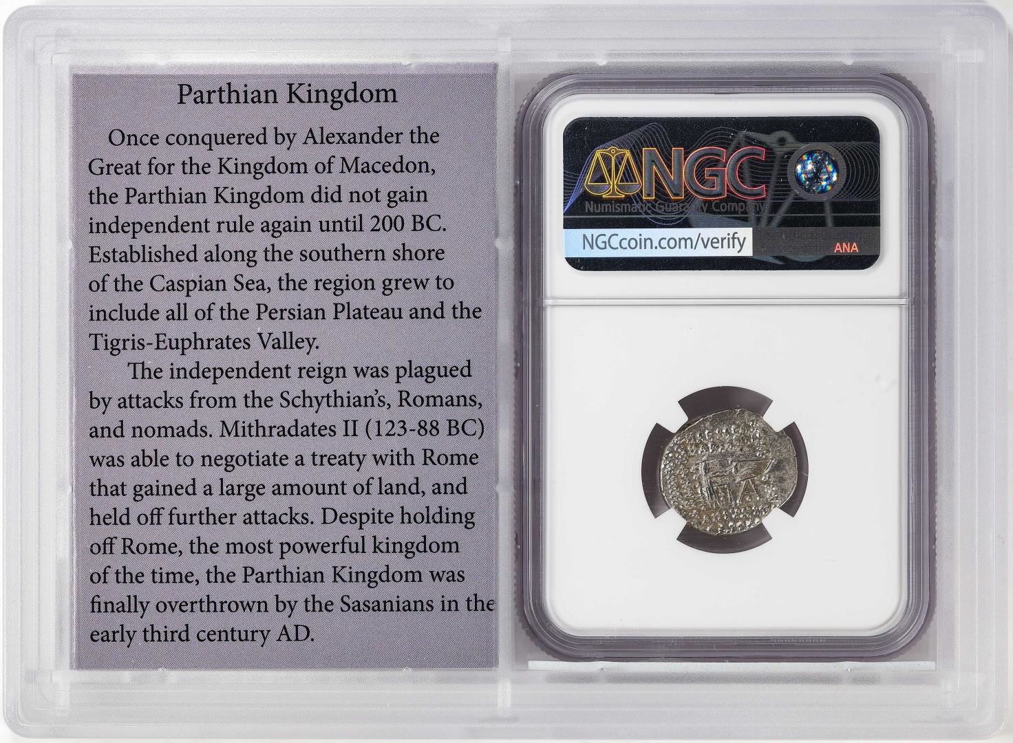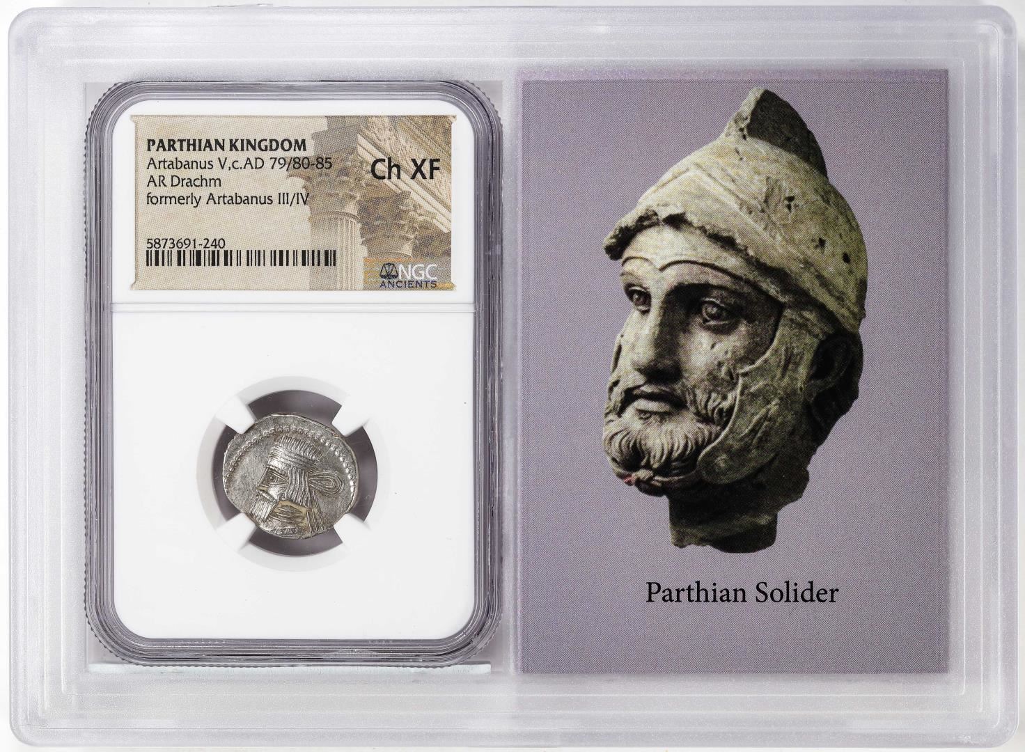 One Parthian Kingdom 79/80-85 c.AD Artabanus V AR Drachm Ancient Coin NGC Ch XF Story Box. NGC Certified.