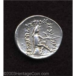 <TABLE cellSpacing=0 cellPadding=0 width="100%" bgColor=#000000 border=0><TBODY> <TR><TD width="100%"><TABLE cellSpacing=1 cellPadding=3 width="100%" border=0><TBODY><TR><TD width="100%" bgColor=#79735c><FONT face=arial color=#ffffff size=3><B>Description</B> </FONT></TD></TR><TR><TD width="100%" bgColor=#ffffff><FONT face=arial size=2><B>Parthian Kingdom. Mithradates I.</B></I> 171-138 B.C. AR drachm (20 mm, 3.28 g). Diademed bust left / Archer seated right, holding bow in right hand. Shore 24 (same obverse die); Sellwood 11.1. VF, faint obverse scratch. Scarce. </FONT></TD></TR></TBODY></TABLE></TD></TR></TBODY></TABLE><BR><A name=PricesRealized></A><TABLE cellSpacing=0 cellPadding=0 width="100%" bgColor=#000000 border=0><TBODY><TR><TD width="100%"><TABLE cellSpacing=1 cellPadding=3 width="100%" border=0><TBODY><TR><TD width="100%" bgColor=#79735c><A name=PR><FONT face=arial color=#ffffff size=3><B>Previous Prices from Heritage Auctions</B> </FONT></A></TD></TR><TR><TD bgColor=#f6f6ed>No Prior Data Recorded </TD></TR><TR><TD bgColor=#ffffff><FONT face=arial size=1 ?>PLEASE NOTE: All prices realized reflect the final hammer price PLUS the buyer's premium in auctions that charge a buyer's premium. Each item has a notation at the top of the listing indicating whether that lot included a buyer's premium. Example: A item that sells with a final hammer price of $100 and a 20% buyer's premium will display with a price realized of $120. All information listed is intended to be as accurate as possible, but errors are possible. Please use this guide carefully and inform us of any inaccuracies. </FONT></TD></TR></TBODY></TABLE></TD></TR></TBODY></TABLE><BR><TABLE cellSpacing=0 cellPadding=0 width="100%" bgColor=#000000 border=0><TBODY><TR><TD width="100%"><TABLE cellSpacing=1 cellPadding=3 width="100%" border=0><TBODY><TR><TD width="100%" bgColor=#79735c colSpan=6><FONT face=arial color=#ffffff size=3><B>Price Guide*</B> </FONT></TD></TR><TR bgColor=#f6f6ed><TD align=middle><B>Grade</B> </TD><TD align=middle><B>Coin World<BR>(Trends)</B> </TD><TD align=middle><B>Numismedia<BR>Retail</B> </TD><TD align=middle><B>Numismedia<BR>Wholesale</B> </TD><TD align=middle><B>Coin<BR>Universe</B> </TD><TD align=middle><B>Heritage<BR>Value Index</B> </TD></TR><TR bgColor=#ffffff><TD colSpan=6><FONT size=1>*All information listed is intended to be as accurate as possible, but errors are possible. No item may be returned or refused based on this information which is provided as a service to our customers. You should contact each pricing source directly to determine the accuracy of this information. </FONT></TD></TR></TBODY></TABLE></TD></TR></TBODY></TABLE><BR><TABLE cellSpacing=0 cellPadding=0 width="100%" bgColor=#000000 border=0><TBODY><TR><TD width="100%"><TABLE cellSpacing=1 cellPadding=3 width="100%" border=0><TBODY><TR><TD width="100%" bgColor=#79735c><FONT face=arial color=#ffffff size=3><B>Population Guide</B> </FONT></TD></TR><TR bgColor=#ffffff> Important notice: Heritage usually auctions material at the rate of 200-250 lots per hour. On some occasions eBay Live bid software or the Internet may not be able to keep up with the pace of the auction. We recommend placing a realistic absentee bid now as insurance to avoid disappointment. Occasionally the auctioneer may eliminate or reject an eBay Live bid, and the auctioneer may also reopen a lot after the close of the eBay live bidding (usually because we missed an audience bid), and may reject your bid even if it shows you as the winning bidder. By bidding via eBay Live, you agree that Heritage may award the lot to another bidder at its sole discretion under the circumstances described above or any other reasonable circumstances. Also please note that all Heritage lots purchased through eBay Live carry a 20% Buyer's Premium. Please make sure you read the Terms and Conditions before you bid.</TD></TR></TBODY></TABLE></TD></TR></TBODY></TABLE>