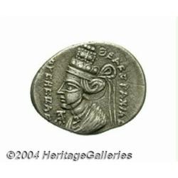 Parthian Kingdom. Phraatakes and Musa. 2 B.C.-A.D. 4. AR drachm (23 mm, 3.57 g). Diademed bust of Phraatakes left; Nike on either side of bust crowning him / Diademed bust of Musa left, wearing tiara and necklace with central medallion; monogram below chin. Sellwood 58.9; Shore 324. Toned VF, possibly overstruck. Rare. Important notice: Heritage usually auctions material at the rate of 200-250 lots per hour. On some occasions eBay Live bid software or the Internet may not be able to keep up with the pace of the auction. We recommend placing a realistic absentee bid now as insurance to avoid disappointment. Occasionally the auctioneer may eliminate or reject an eBay Live bid, and the auctioneer may also reopen a lot after the close of the eBay live bidding (usually because we missed an audience bid), and may reject your bid even if it shows you as the winning bidder. By bidding via eBay Live, you agree that Heritage may award the lot to another bidder at its sole discretion under the circumstances described above or any other reasonable circumstances. Also please note that all Heritage lots purchased through eBay Live carry a 20% Buyer's Premium. Please make sure you read the Terms and Conditions before you bid.