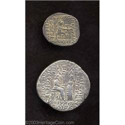 <TABLE cellSpacing=0 cellPadding=0 width="100%" bgColor=#000000 border=0><TBODY> <TR><TD width="100%"><TABLE cellSpacing=1 cellPadding=3 width="100%" border=0><TBODY><TR><TD width="100%" bgColor=#79735c><FONT face=arial color=#ffffff size=3><B>Description</B> </FONT></TD></TR><TR><TD width="100%" bgColor=#ffffff><FONT face=arial size=2><B>Parthian Kingdom. Phraates IV.</B></I> 38-2 B.C. AR tetradrachm (30 mm, 13.76 g). Dated Artemistion, S.E. 288 (= April, 25 B.C.). Diademed bust left / King enthroned right, receiving palm from Tyche standing left. Sellwood 51.32; Shore 272 var. (year and month). Toned VF, minor reverse porosity // Lot also includes a drachm of Orodes I, Shore 131, grading toned VF. (2 coins) </FONT></TD></TR></TBODY></TABLE></TD></TR></TBODY></TABLE><BR><A name=PricesRealized></A><TABLE cellSpacing=0 cellPadding=0 width="100%" bgColor=#000000 border=0><TBODY><TR><TD width="100%"><TABLE cellSpacing=1 cellPadding=3 width="100%" border=0><TBODY><TR><TD width="100%" bgColor=#79735c><A name=PR><FONT face=arial color=#ffffff size=3><B>Previous Prices from Heritage Auctions</B> </FONT></A></TD></TR><TR><TD bgColor=#f6f6ed>No Prior Data Recorded </TD></TR><TR><TD bgColor=#ffffff><FONT face=arial size=1 ?>PLEASE NOTE: All prices realized reflect the final hammer price PLUS the buyer's premium in auctions that charge a buyer's premium. Each item has a notation at the top of the listing indicating whether that lot included a buyer's premium. Example: A item that sells with a final hammer price of $100 and a 20% buyer's premium will display with a price realized of $120. All information listed is intended to be as accurate as possible, but errors are possible. Please use this guide carefully and inform us of any inaccuracies. </FONT></TD></TR></TBODY></TABLE></TD></TR></TBODY></TABLE><BR><TABLE cellSpacing=0 cellPadding=0 width="100%" bgColor=#000000 border=0><TBODY><TR><TD width="100%"><TABLE cellSpacing=1 cellPadding=3 width="100%" border=0><TBODY><TR><TD width="100%" bgColor=#79735c colSpan=6><FONT face=arial color=#ffffff size=3><B>Price Guide*</B> </FONT></TD></TR><TR bgColor=#f6f6ed><TD align=middle><B>Grade</B> </TD><TD align=middle><B>Coin World<BR>(Trends)</B> </TD><TD align=middle><B>Numismedia<BR>Retail</B> </TD><TD align=middle><B>Numismedia<BR>Wholesale</B> </TD><TD align=middle><B>Coin<BR>Universe</B> </TD><TD align=middle><B>Heritage<BR>Value Index</B> </TD></TR><TR><TD colSpan=6>No Pricing Data Available</TD></TR><TR bgColor=#ffffff><TD colSpan=6><FONT size=1>*All information listed is intended to be as accurate as possible, but errors are possible. No item may be returned or refused based on this information which is provided as a service to our customers. You should contact each pricing source directly to determine the accuracy of this information. </FONT></TD></TR></TBODY></TABLE></TD></TR></TBODY></TABLE><BR><TABLE cellSpacing=0 cellPadding=0 width="100%" bgColor=#000000 border=0><TBODY><TR><TD width="100%"><TABLE cellSpacing=1 cellPadding=3 width="100%" border=0><TBODY><TR><TD width="100%" bgColor=#79735c><FONT face=arial color=#ffffff size=3><B>Population Guide</B> </FONT></TD></TR><TR bgColor=#ffffff><TD ali Important notice: Heritage usually auctions material at the rate of 200-250 lots per hour. On some occasions eBay Live bid software or the Internet may not be able to keep up with the pace of the auction. We recommend placing a realistic absentee bid now as insurance to avoid disappointment. Occasionally the auctioneer may eliminate or reject an eBay Live bid, and the auctioneer may also reopen a lot after the close of the eBay live bidding (usually because we missed an audience bid), and may reject your bid even if it shows you as the winning bidder. By bidding via eBay Live, you agree that Heritage may award the lot to another bidder at its sole discretion under the circumstances described above or any other reasonable circumstances. Also please note that all Heritage lots purchased through eBay Live carry a 20% Buyer's Premium. Please make sure you read the Terms and Conditions before you bid.</TD></TR></TBODY></TABLE></TD></TR></TBODY></TABLE>