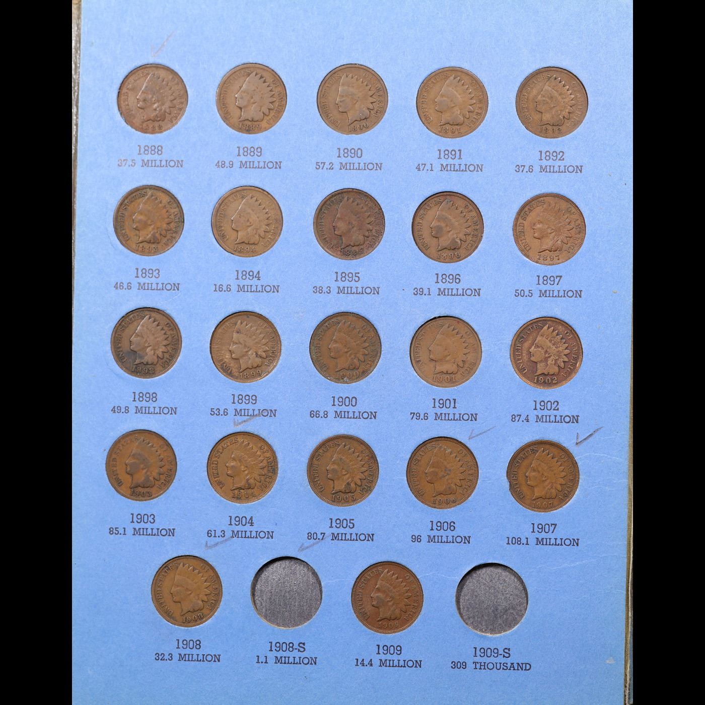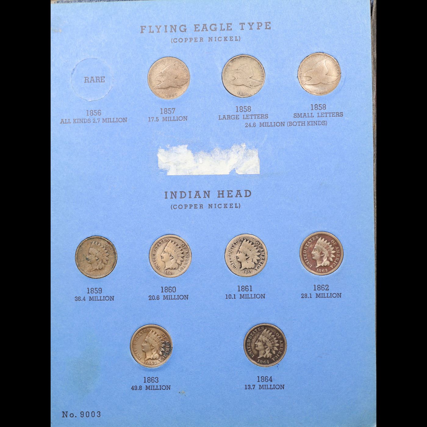 Partial Flying Eagle 1c and Indian 1c Whitman folder. 1857-1858 Eagle and 1859-1909 Indian Head, 45
