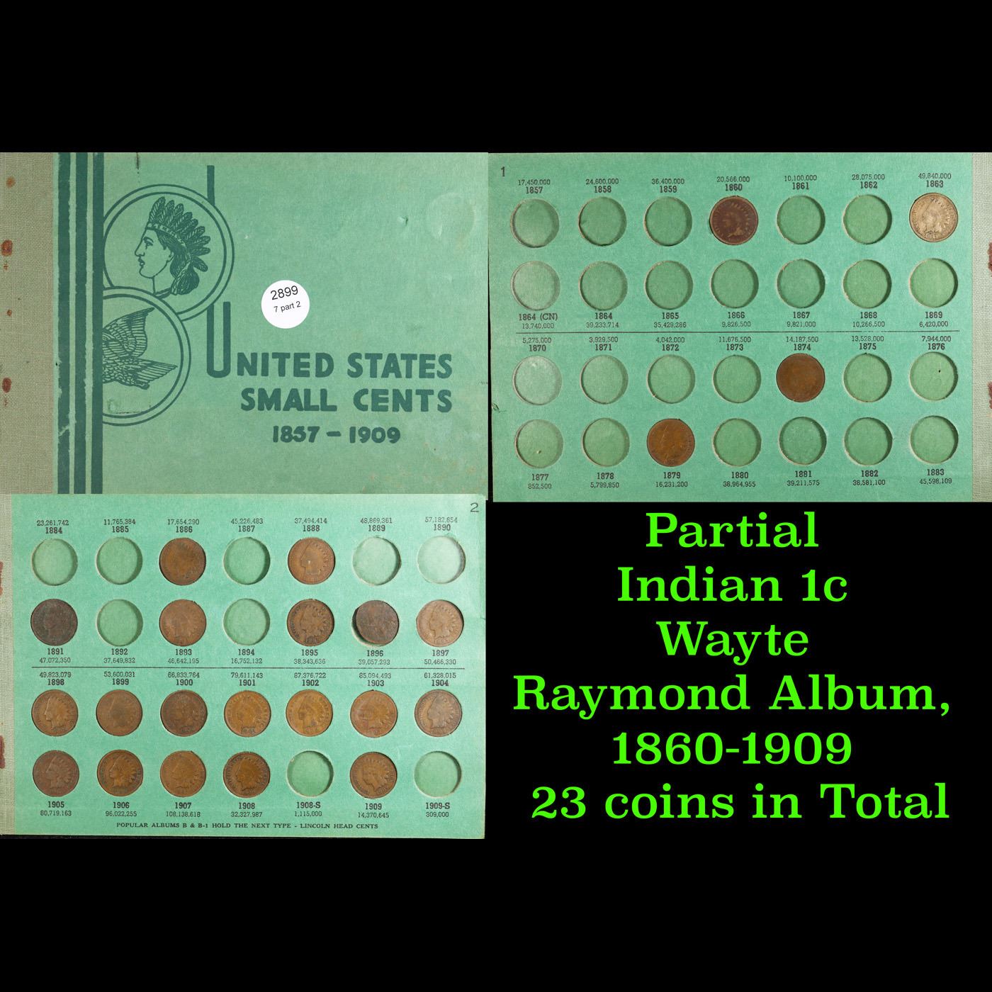Partial Indian 1c Wayte Raymond Album, 1860-1909 23 coins in Total. All coins encased in a Wayte Raymond Coin Album. Date Range from 1860-1909. A Nice grouping of 23 coins.