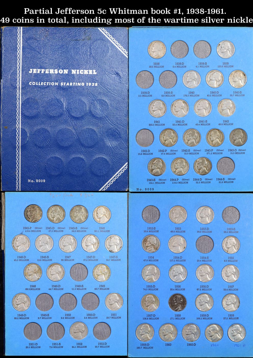 Partial Jefferson 5c Whitman book #1, 1938-1961. 49 coins in total, including most of the wartime silver nickle.. All coins encased in a Whitman Jefferson Nickle Collection starting 1938. Date Range from 1938-1961. A fantastic grouping of 49 coins, including 10 out of 11 wartime silver nickle (excluding 1943-s).