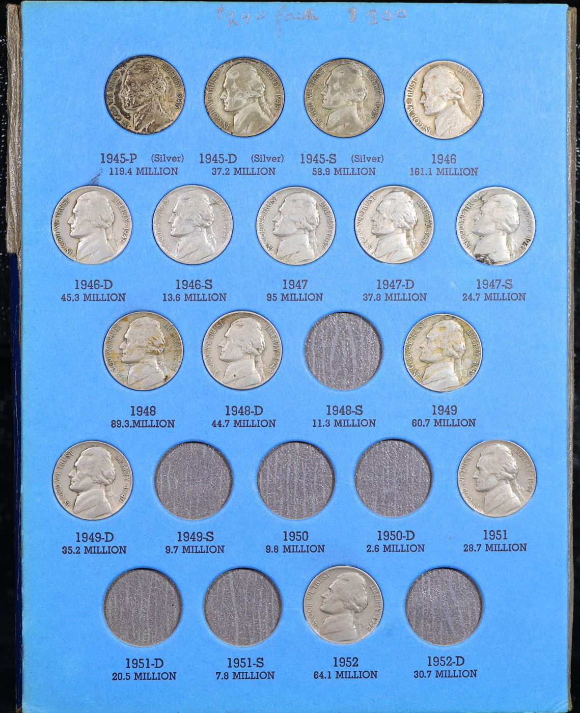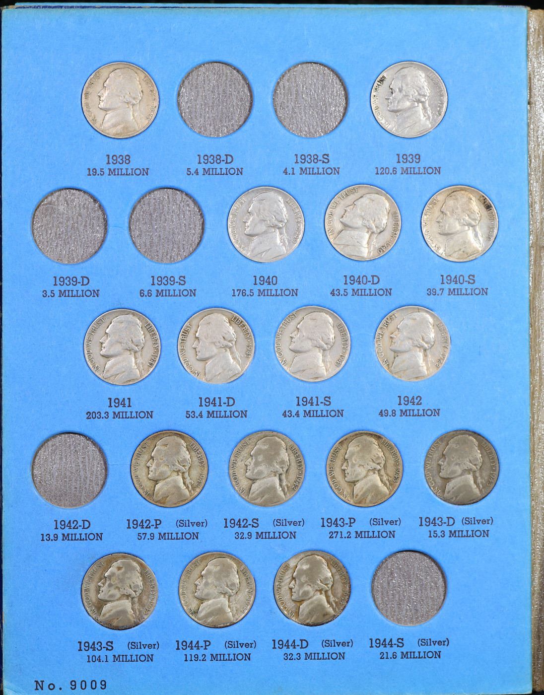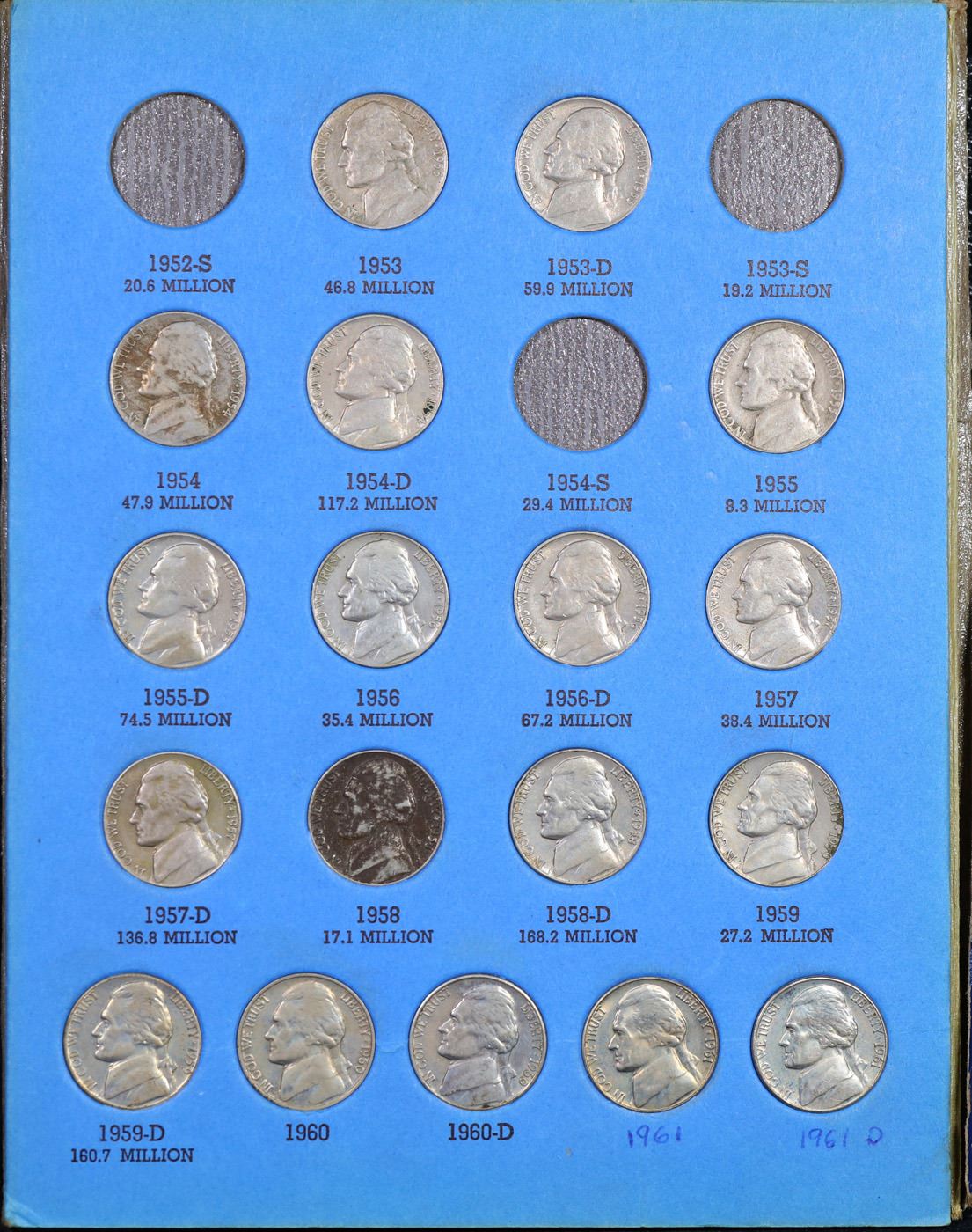 Partial Jefferson 5c Whitman book #1, 1938-1961. 49 coins in total, including most of the wartime si