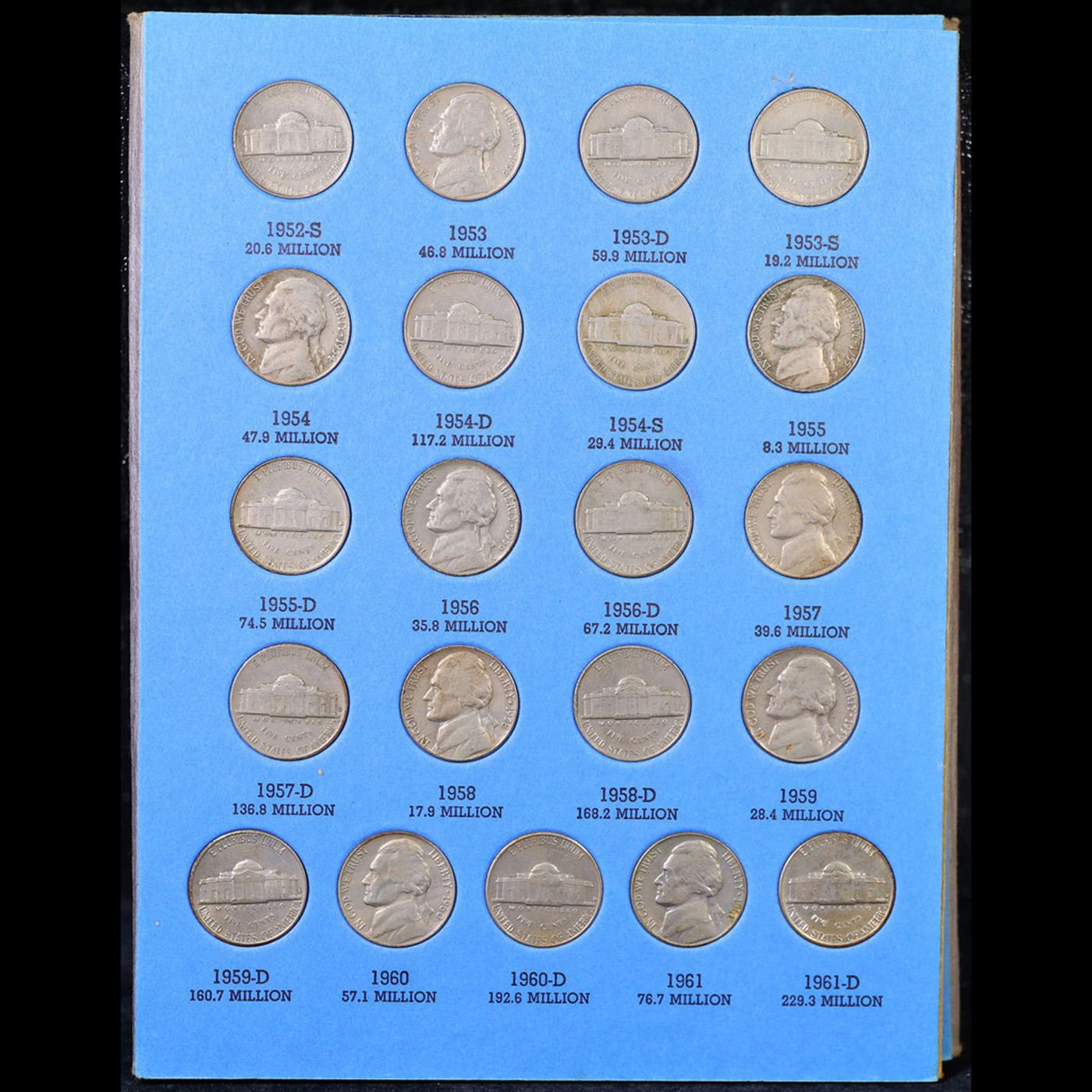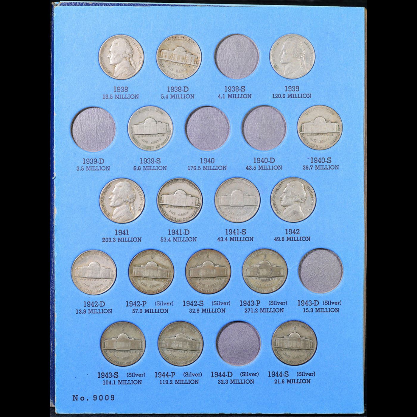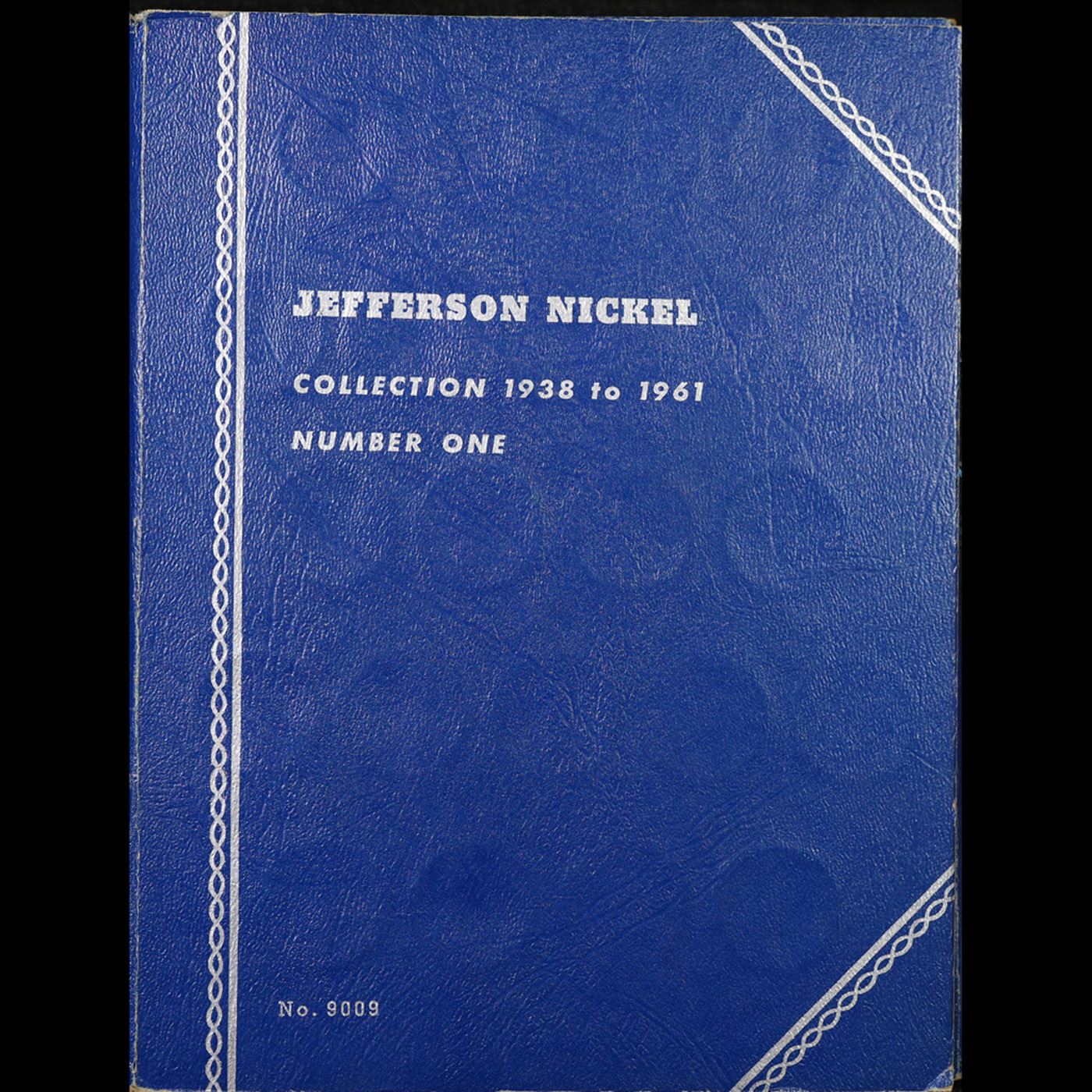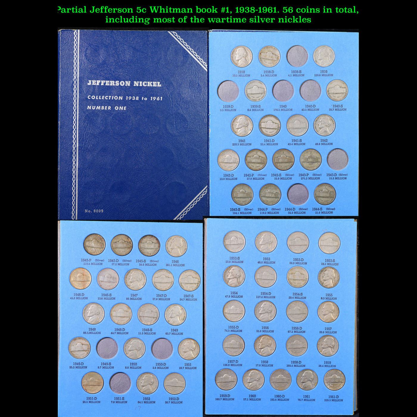 Partial Jefferson 5c Whitman book #1, 1938-1961. 56 coins in total, including most of the wartime silver nickle.. All coins encased in a Whitman Jefferson Nickle Collection starting 1938 to 1961 number 1. Date Range from 1938-1961. A fantastic grouping of 56 coins, including 9 out of 11 wartime silver nickle (1943-d & 1944-d).