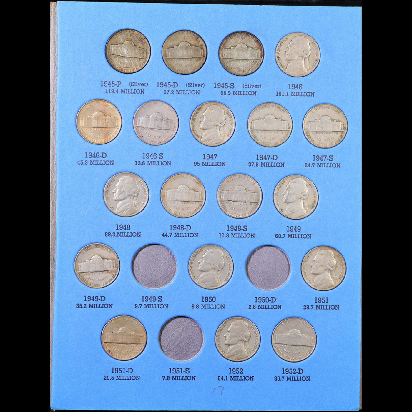 Partial Jefferson 5c Whitman book #1, 1938-1961. 56 coins in total, including most of the wartime si