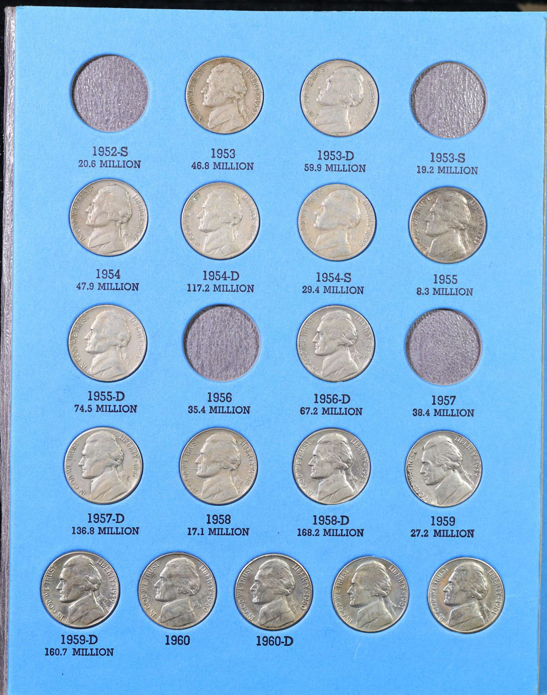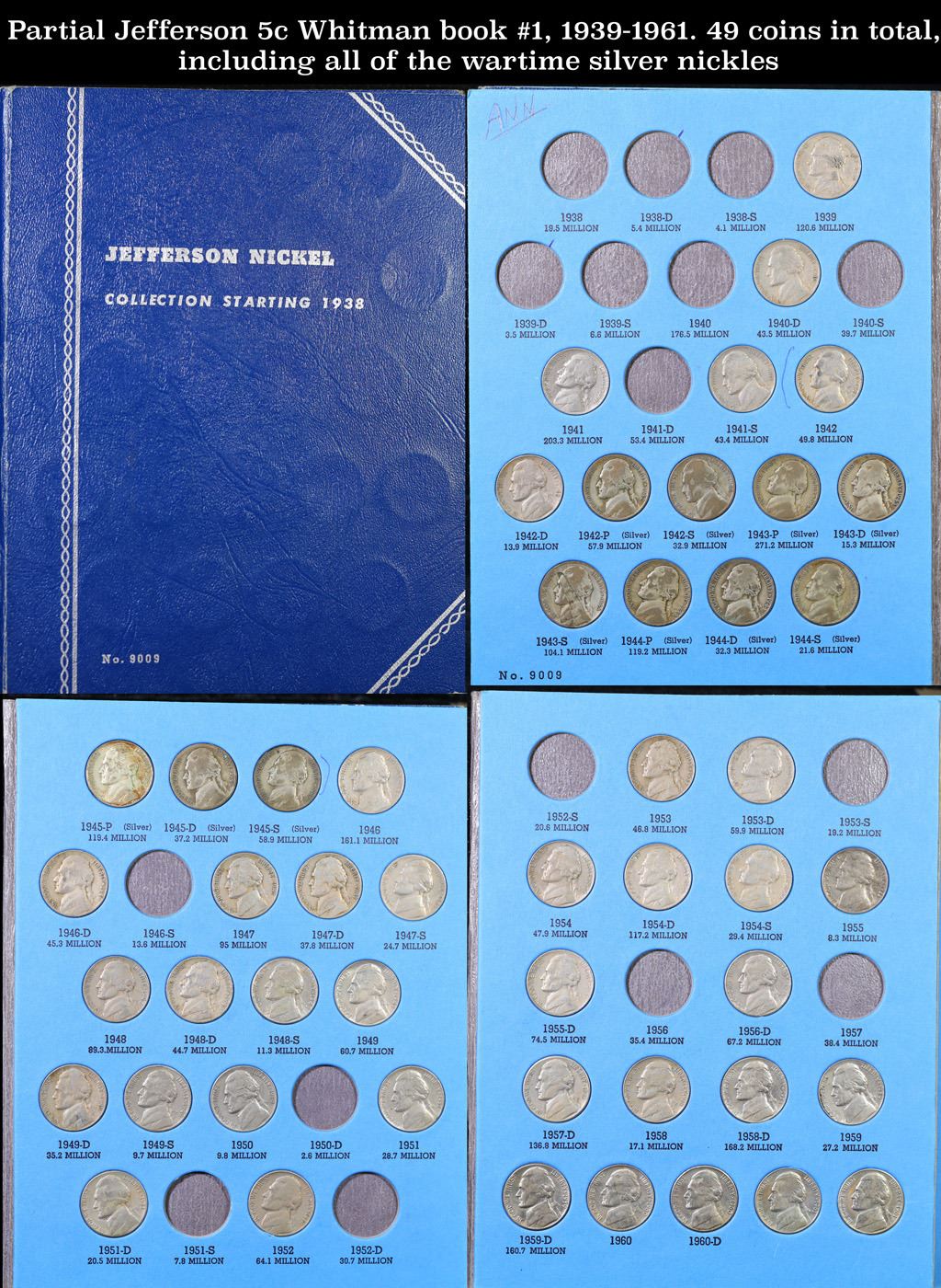 Partial Jefferson 5c Whitman book #1, 1939-1961. 49 coins in total, including all of the wartime silver nickle.. All coins encased in a Whitman Jefferson Nickle Collection starting 1938 to 1961 number 1. Date Range from 1939-1961. A fantastic grouping of 49 coins, including the 11 wartime silver nickle from 1942-1945.