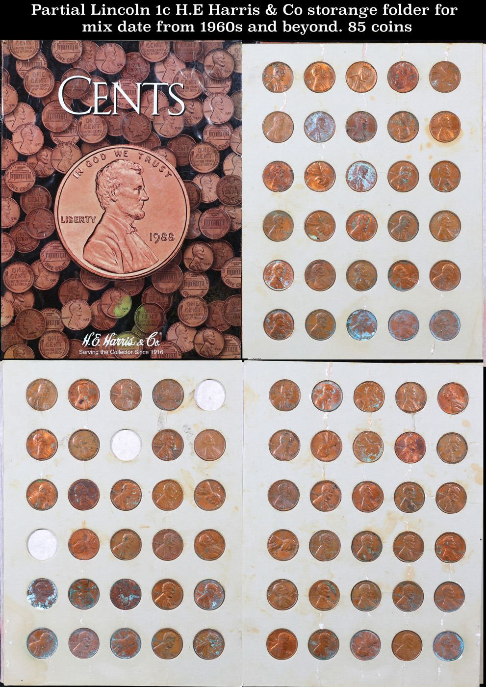 Partial Lincoln 1c H.E Harris & Co storange folder for mix date from 1960s and beyond. 85 coins.. All coins encased in a H.E Harris & Co Lincoln Cent Folder . Dates are from 1960 and foward. A grouping of 85 coins.