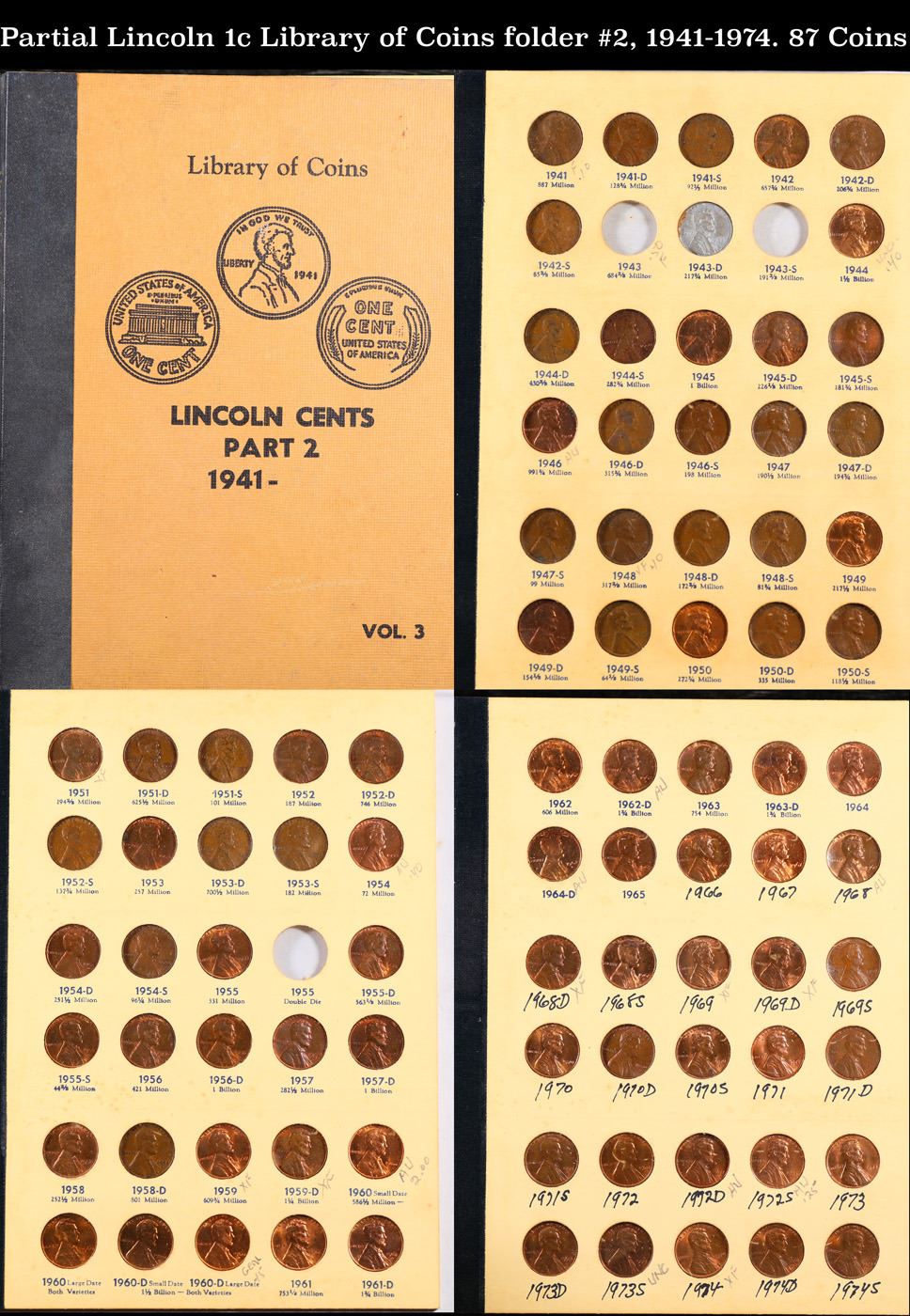Partial Lincoln 1c Library of Coins folder #2, 1941-1974. 87 Coins. All coins encased in a nice Library of Coins Lincoln One Cent Part 2 Volume 3. Dates Range from 1941-1974. A fantastic grouping of 87 coins.