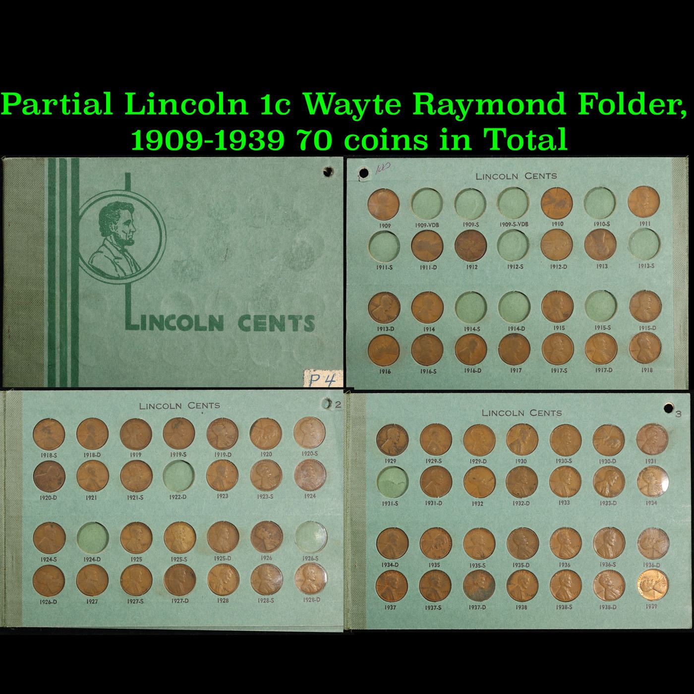 Partial Lincoln 1c Wayte Raymond Folder, 1909-1939 70 coins in Total. All coins encased in a Whitman Coin Album. Date Range from 1909-1939. A Nice grouping of 70 coins.