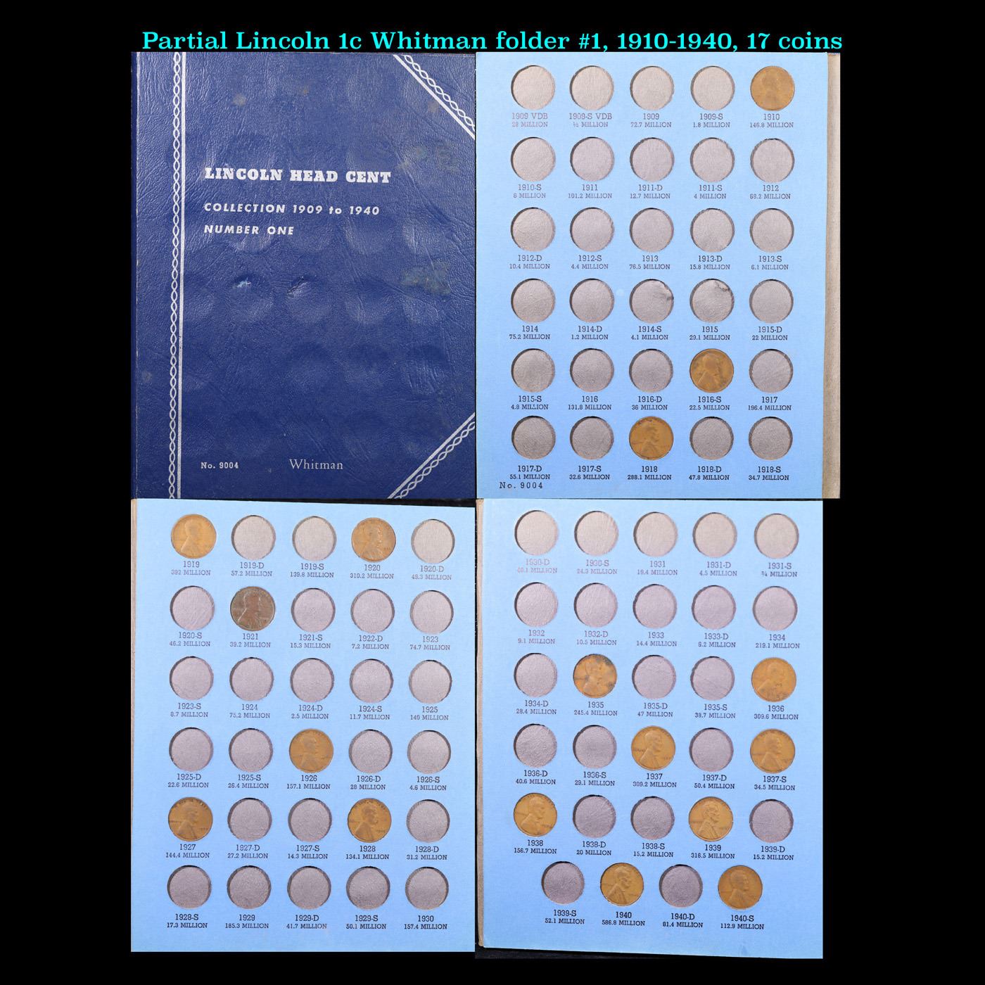 Partial Lincoln 1c Whitman folder #1, 1910-1940, 17 coins.. All coins encased in a nice Whitman Lincoln One Cent Folder Number 1 . Dates Range from 1909-1940. A fantastic grouping of 17 coins, 4 of which is from 1909-1919.