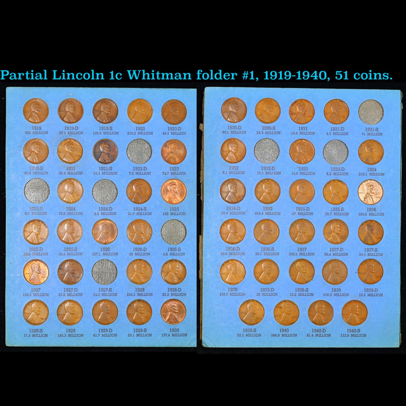 Partial Lincoln 1c Whitman folder #1, 1919-1940, 51 coins.. All coins encased in a nice Whitman Lincoln One Cent Folder Number 1 . Dates Range from 1919-1940. A fantastic grouping of 51 coins, 3 of which is from 1909-1919.