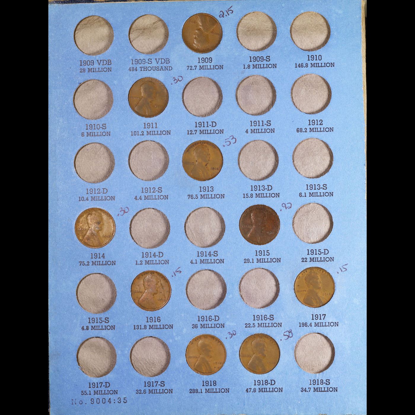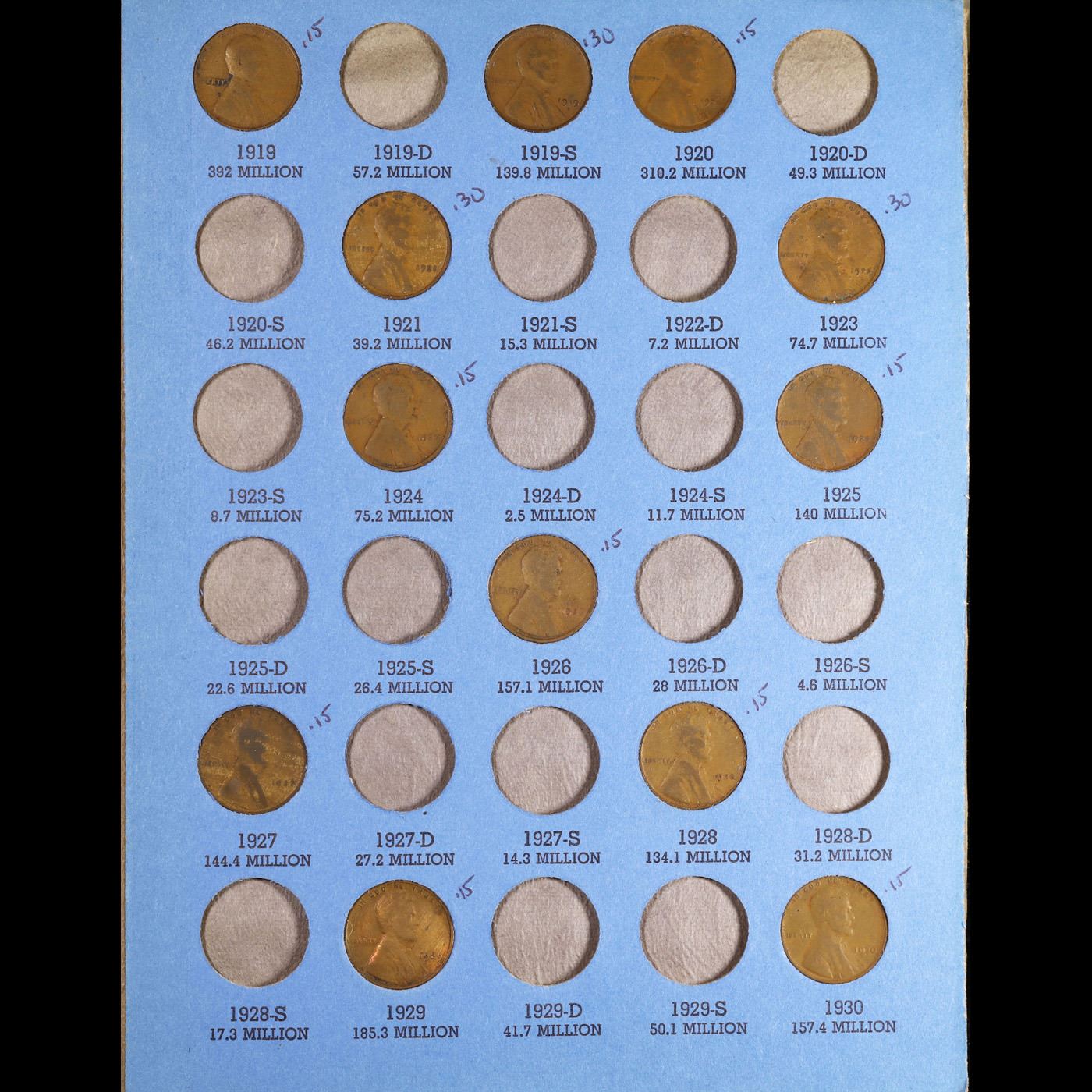 Partial Lincoln 1c Whitman folder, 1909-1940, 38 coins. 11 of the coins are from 1909-1919