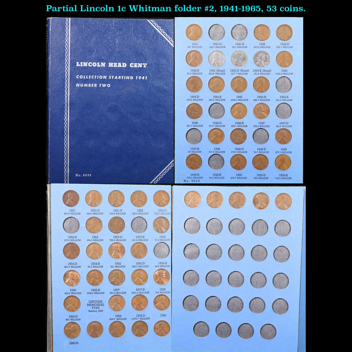 Partial Lincoln 1c Whitman folder #2, 1941-1965, 53 coins.. All coins encased in a Whitman Lincoln Cent 1941-"Present Day" book #2. Date Range from 1941-1965. A fantastic grouping of 53 coins.