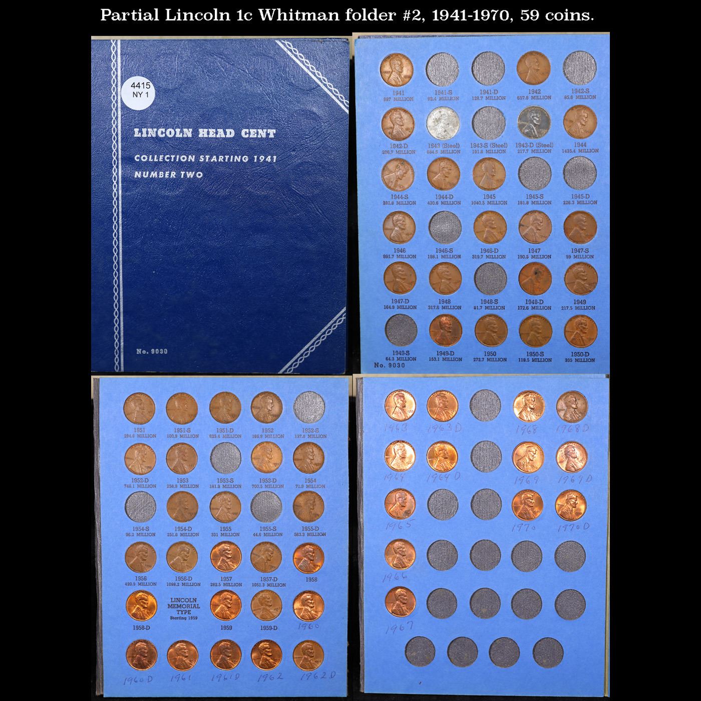 Partial Lincoln 1c Whitman folder #2, 1941-1970, 59 coins.. All coins encased in a Whitman Lincoln Cent 1941-"Present Day" book #2. Date Range from 1941-1970. A fantastic grouping of 59 coins.