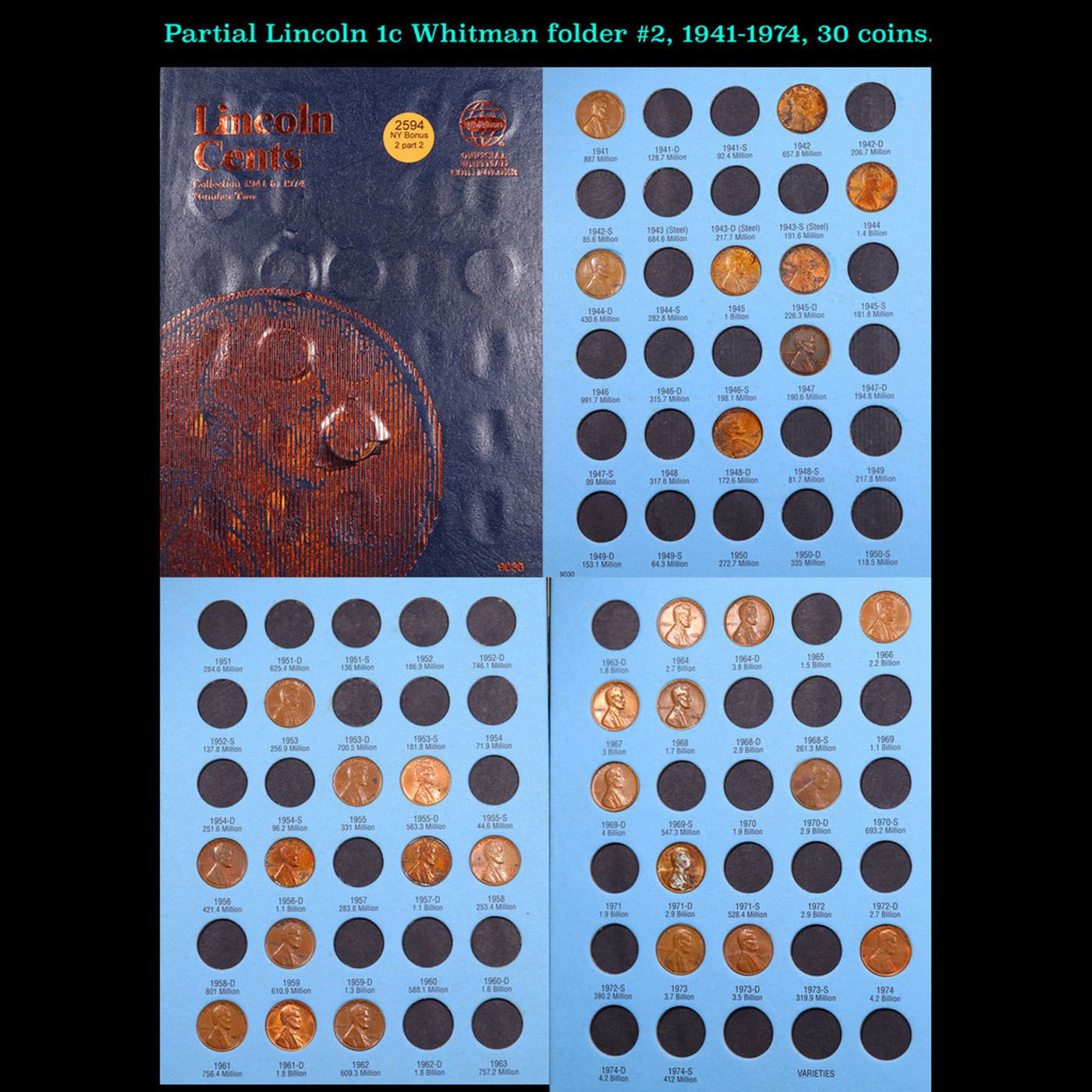 Partial Lincoln 1c Whitman folder #2, 1941-1974, 30 coins.. All coins encased in a Whitman Lincoln Cent 1941-"Present Day" book #2. Date Range from 1941-1974. A fantastic grouping of 30 coins.