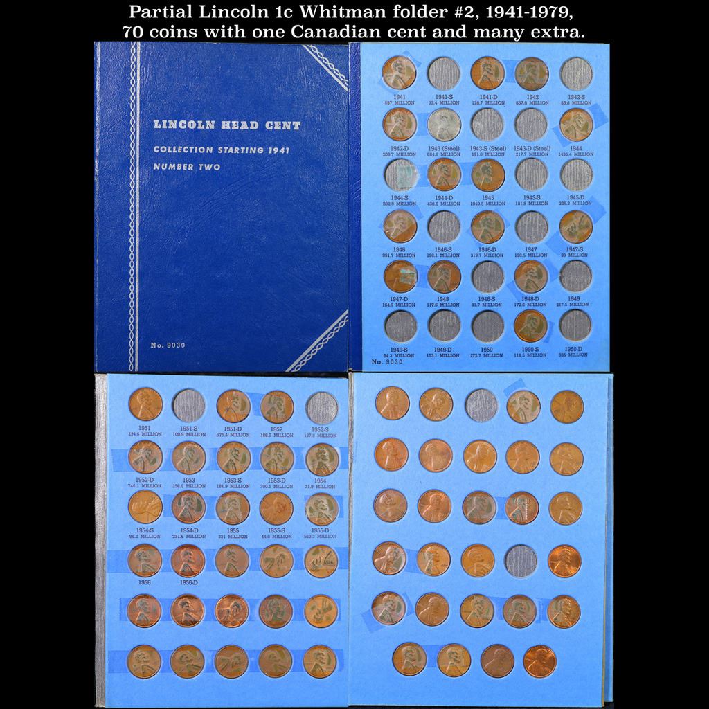 Partial Lincoln 1c Whitman folder #2, 1941-1979, 70 coins with one Canadian cent and many extra.. All coins encased in a Whitman Lincoln Cent 1941-"Present Day" book #2. Date Range from 1941-1979, the date of the Canadian 1c cannot be determine dude to it being tape down but it is most likely 1965 to 1989. A fantastic grouping of 70 coins, many of which are extra dates.