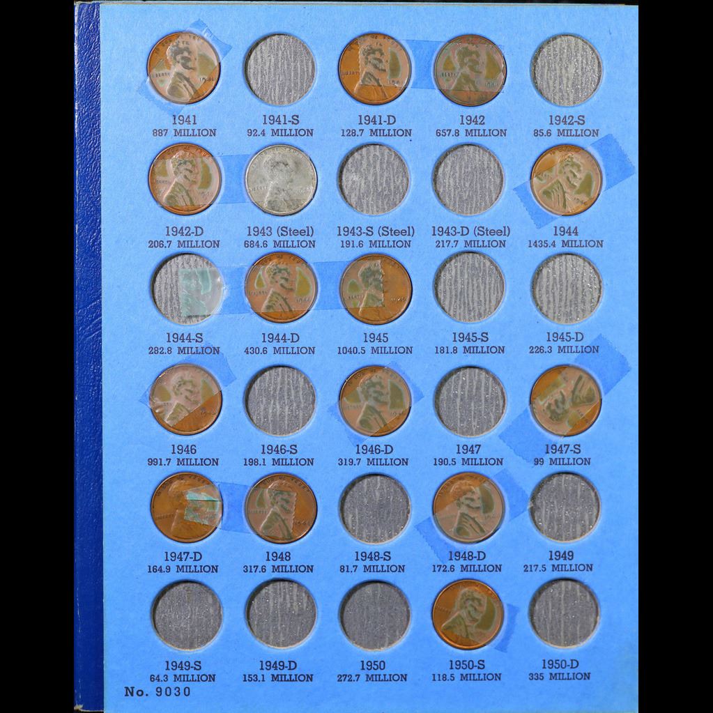 Partial Lincoln 1c Whitman folder #2, 1941-1979, 70 coins with one Canadian cent and many extra.